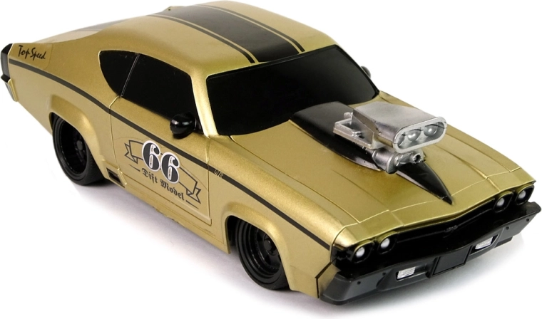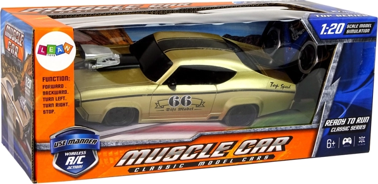 Geniet van een adrenalinerit met deze gouden RC-auto in de stijl van een klassieke muscle car op schaal 1:20. Hij heeft een sportief design met zwarte strepen, rubberen banden voor betere grip en eenvoudige bediening via de meegeleverde afstandsbediening. Een geweldige keuze voor zowel kinderen als volwassen liefhebbers van racen en driften.
