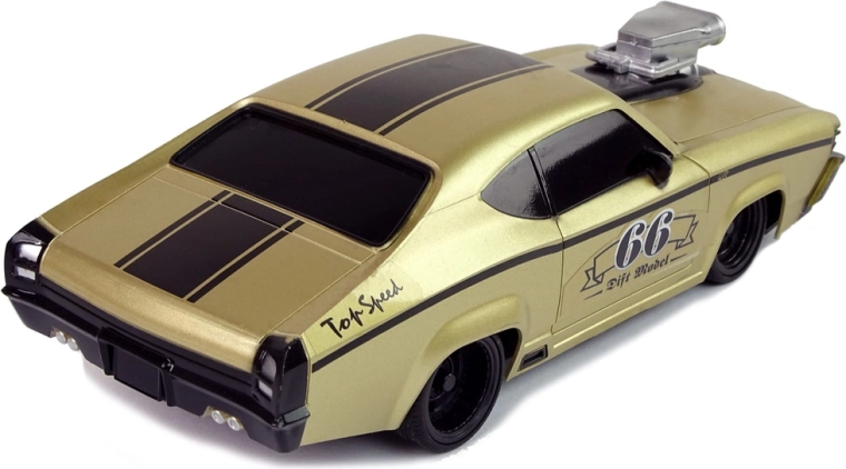 De gouden carrosserie met zwarte racestrepen en een gedetailleerde “supercharger” op de motorkap geeft het model een authentiek racekarakter.