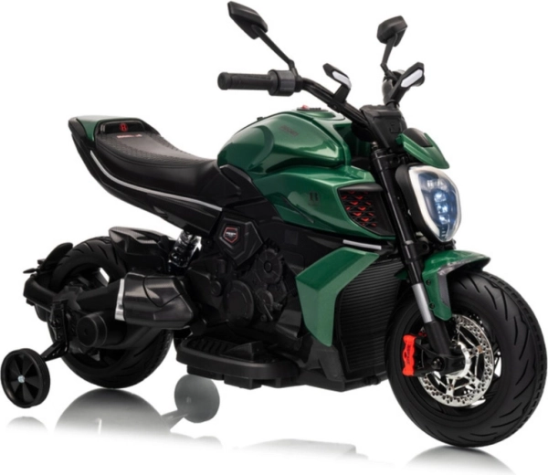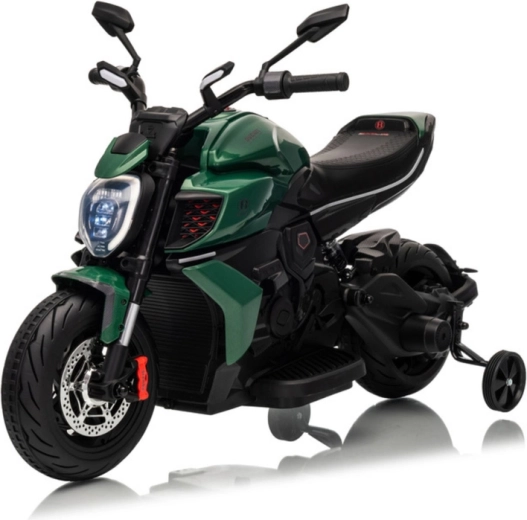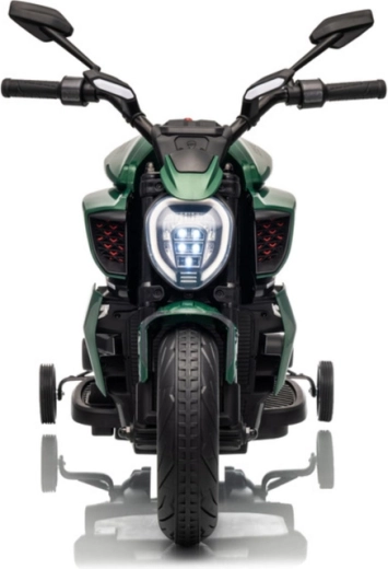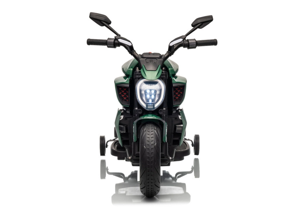 De elektrische kindermotor in het groen valt op door zijn sportieve uitstraling en veilige constructie. Dankzij de brede banden en de stabiliserende zijwieltjes voelen kinderen zich snel zeker, terwijl de heldere LED-koplamp en realistische details (achteruitkijkspiegels, remschijf-look) de echte motorervaring versterken.