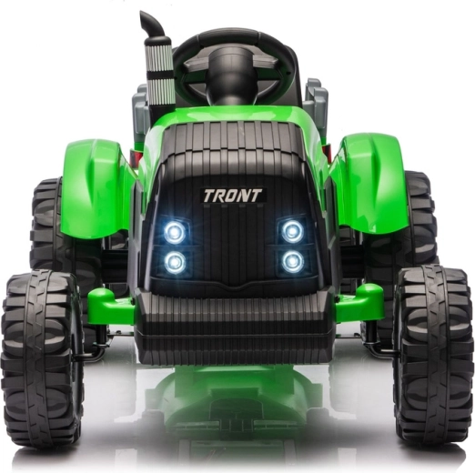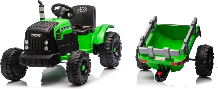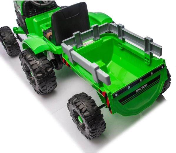 Robuuste elektrische kindertractor met een lichtgroene carrosserie en een afkoppelbare aanhanger voor kleine helpers in de tuin. Biedt een krachtige 24V-aandrijving, grote terreinbanden voor stabiliteit en een veilige zitplaats met gordel. Perfect voor buitenspeelplezier, het vervoeren van speelgoed en het ontwikkelen van motorische vaardigheden.