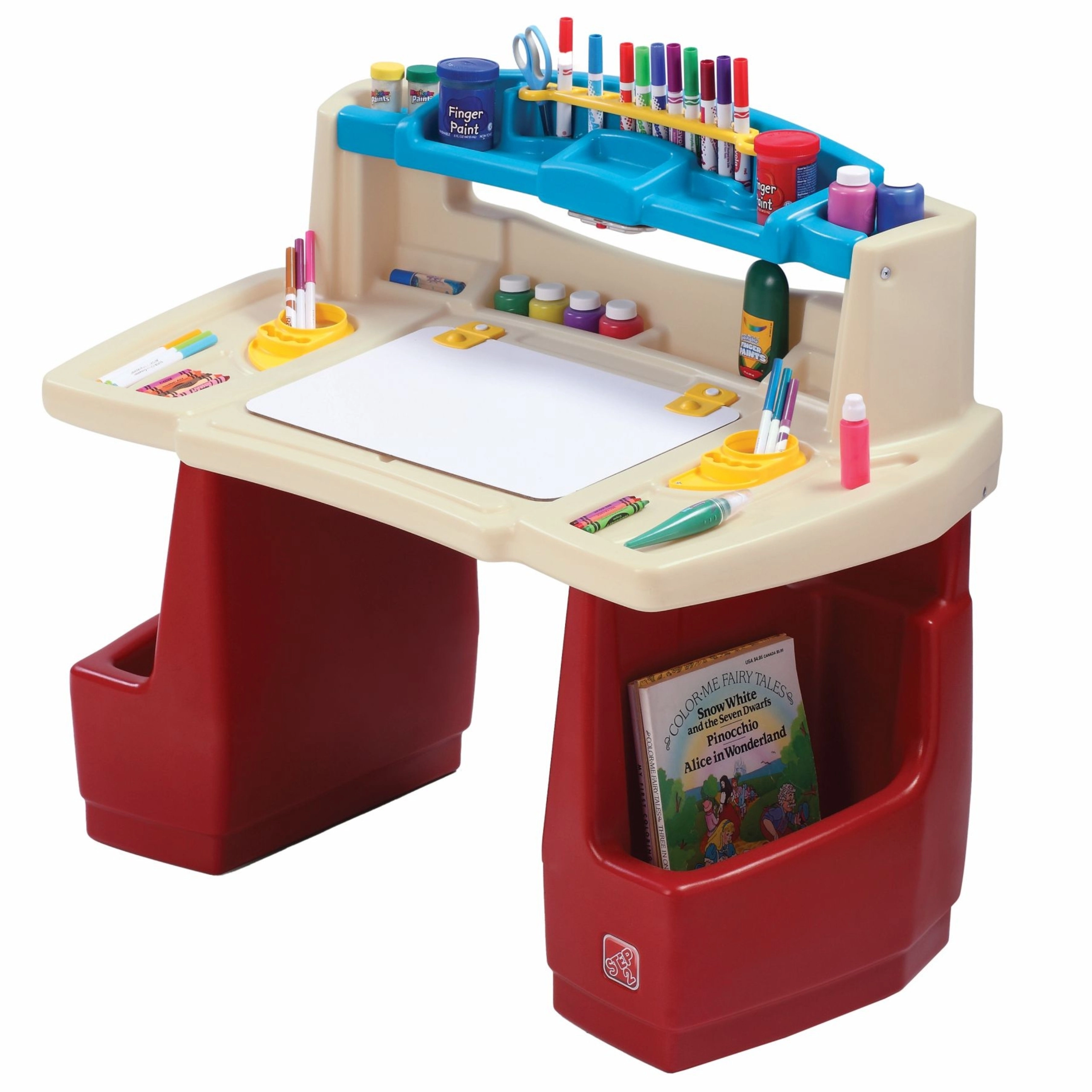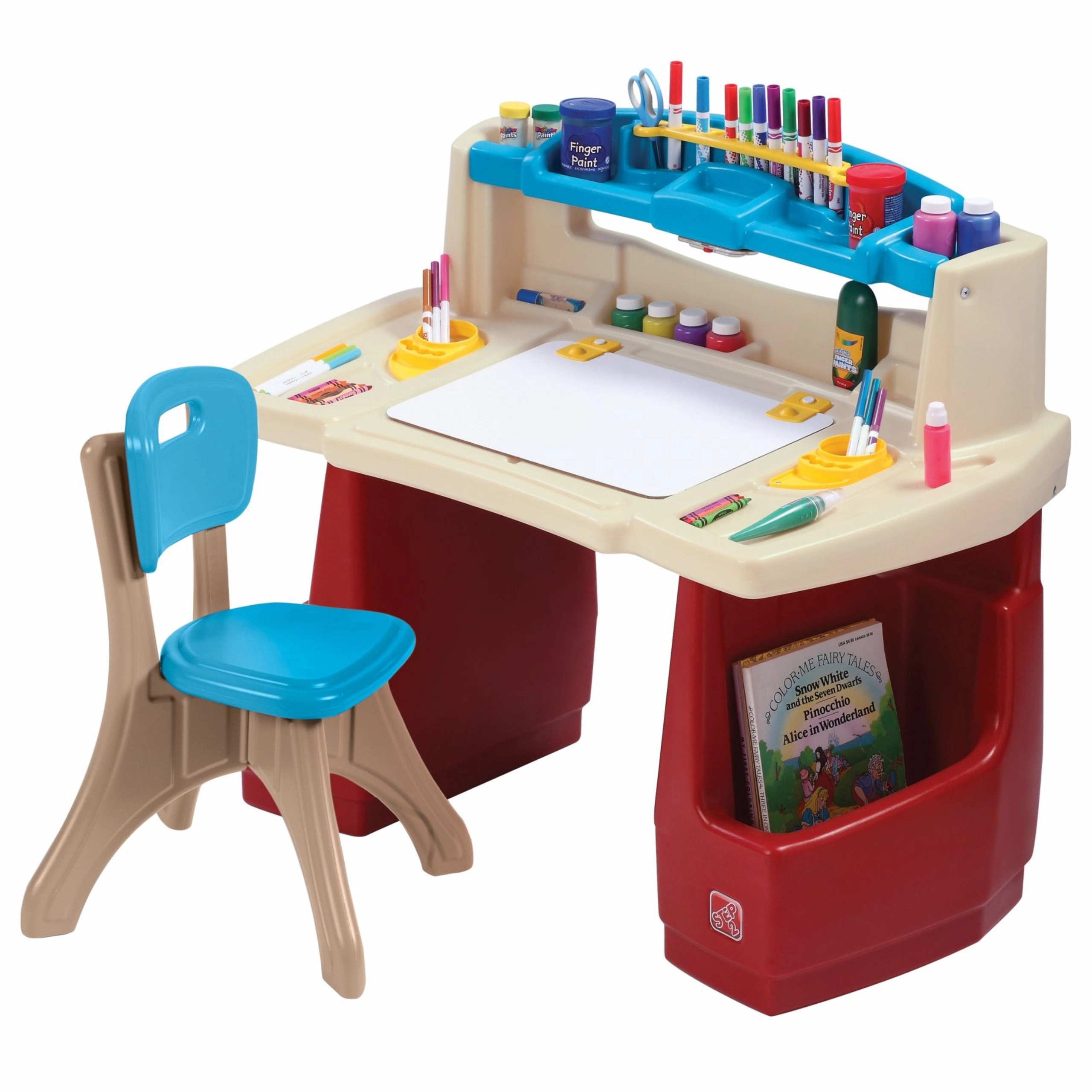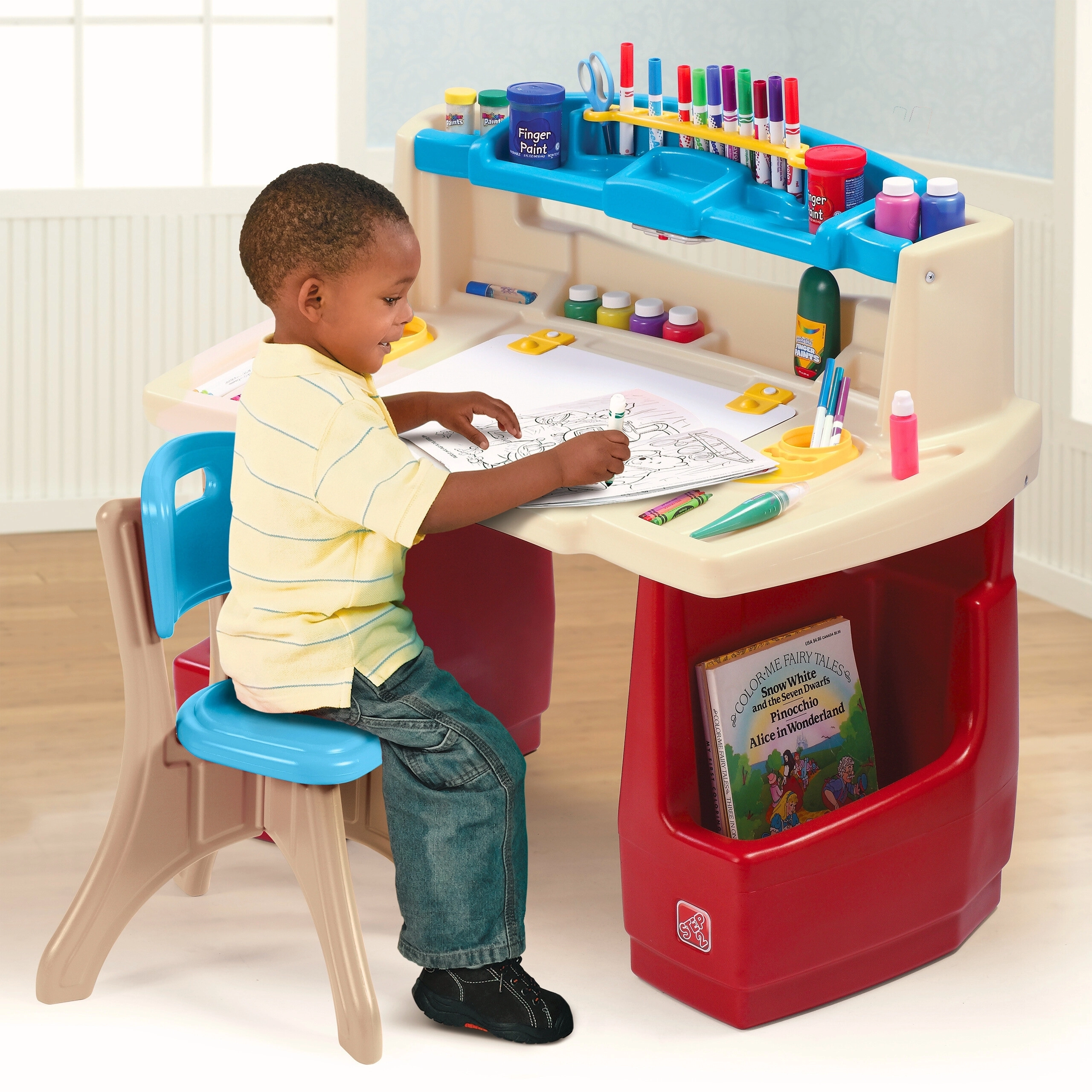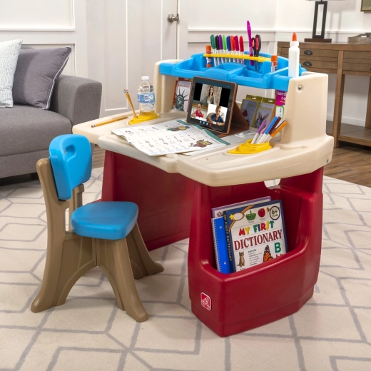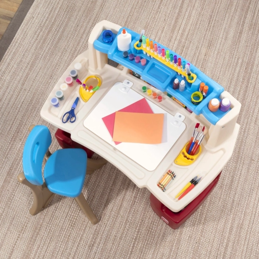 De STEP2 Deluxe Art Master set verandert de kinderkamer in een inspirerend atelier. Kinderen hebben de beschikking over een groot werkvlak met een kantelbaar afwisbaar bord dat gemakkelijk schoon te maken is en extra opbergruimte voor materialen verbergt. De bovenste organizer, zijmanden en verticale vakken houden potloden, verf, boeken en tablet altijd binnen handbereik.