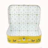 Het koffertje is uitgerust met een metalen sluiting en een stevige greep, wat zorgt voor eenvoudige draagbaarheid en veilige sluiting.