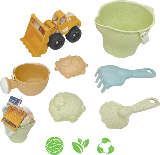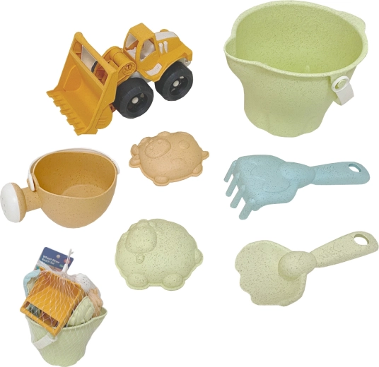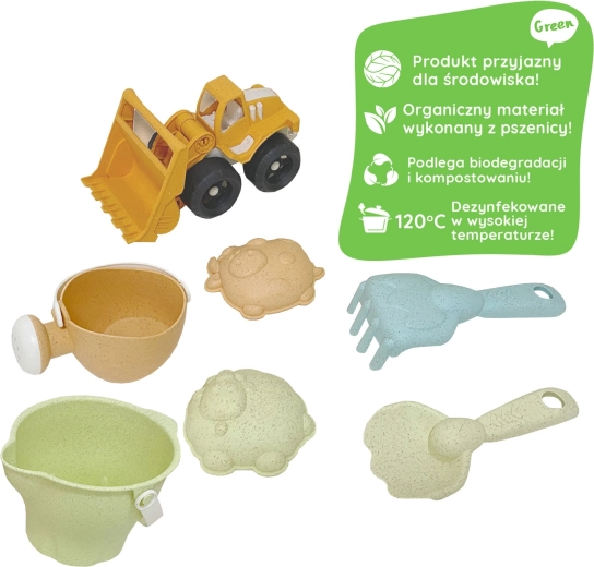 De WOOPIE GREEN zandset is ontworpen voor plezier en duurzaamheid. De onderdelen worden gedesinfecteerd op 120 °C, waardoor ze veilig voor kinderen zijn, en zijn gemaakt van organisch materiaal op tarwebasis dat in de grond natuurlijk afbreekt. Het pastelontwerp spreekt zowel kinderen als ouders aan en stimuleert creatief bouwen van kastelen, vormgeven en zand vervoeren met het autootje.