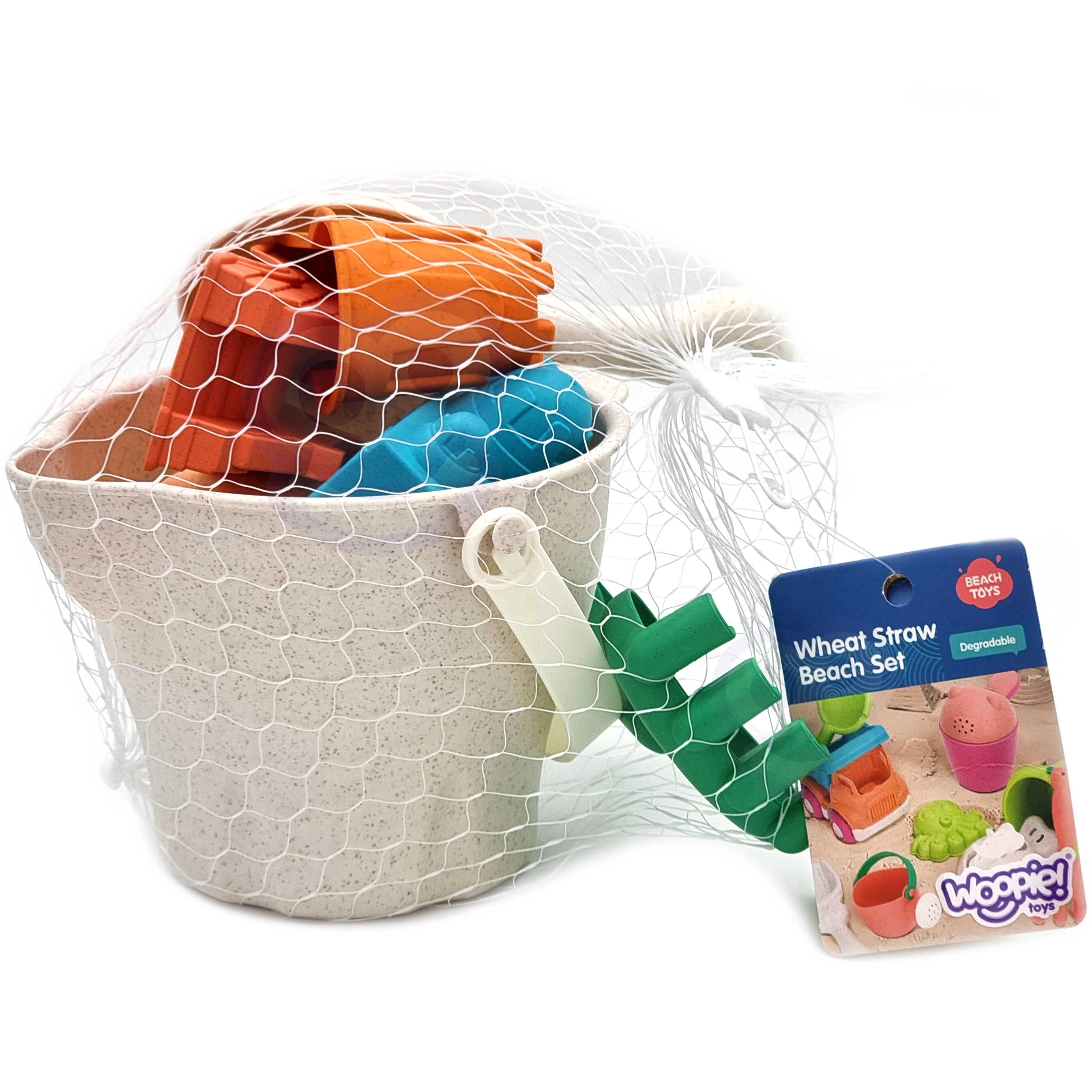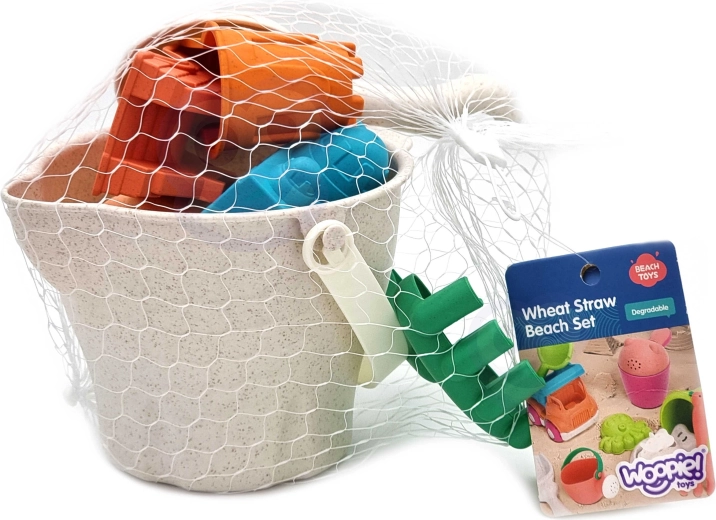 De WOOPIE GREEN zandset voor kinderen biedt een 8-delige set voor plezier in de zandbak, op het strand en in de tuin. Bevat een emmer, gieter, 4 vormpjes, schep en hark in trendy pasteltinten. Gemaakt van organisch, biologisch afbreekbaar materiaal dat geschikt is voor compostering, met comfortabele handgrepen en een oppervlak dat gedesinfecteerd is bij 120 °C voor maximale veiligheid.