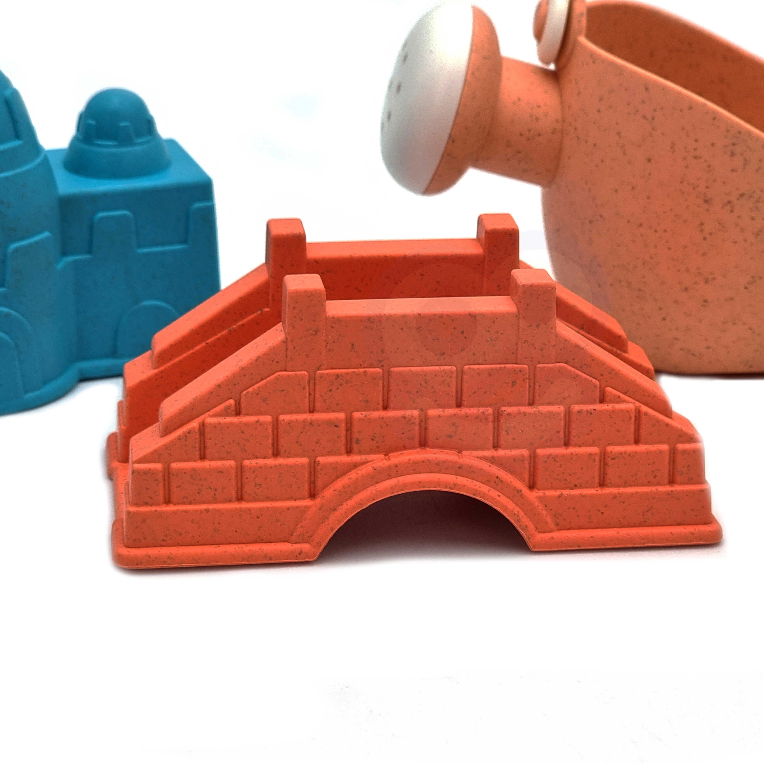 Vormpjes met motieven van kasteelmuren en een brug helpen kinderen stevige en gedetailleerde zandbouwsels te maken – perfect voor zandbak en strand.