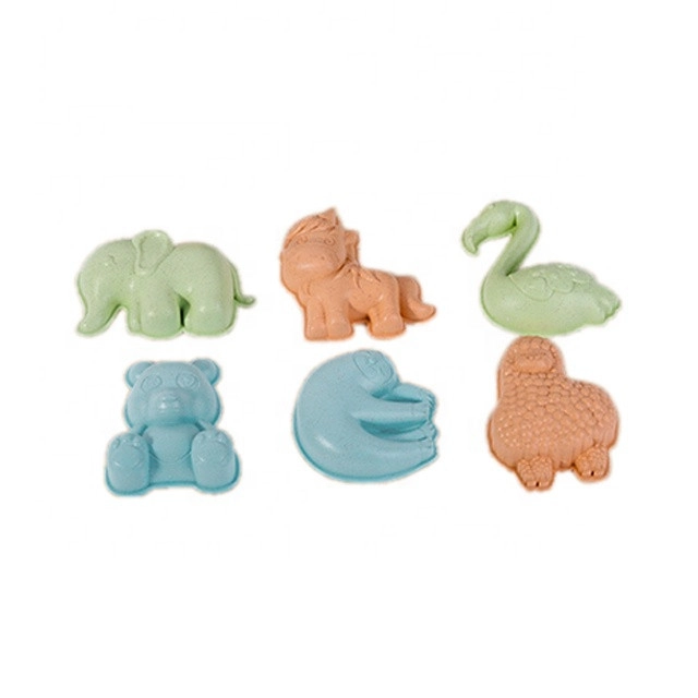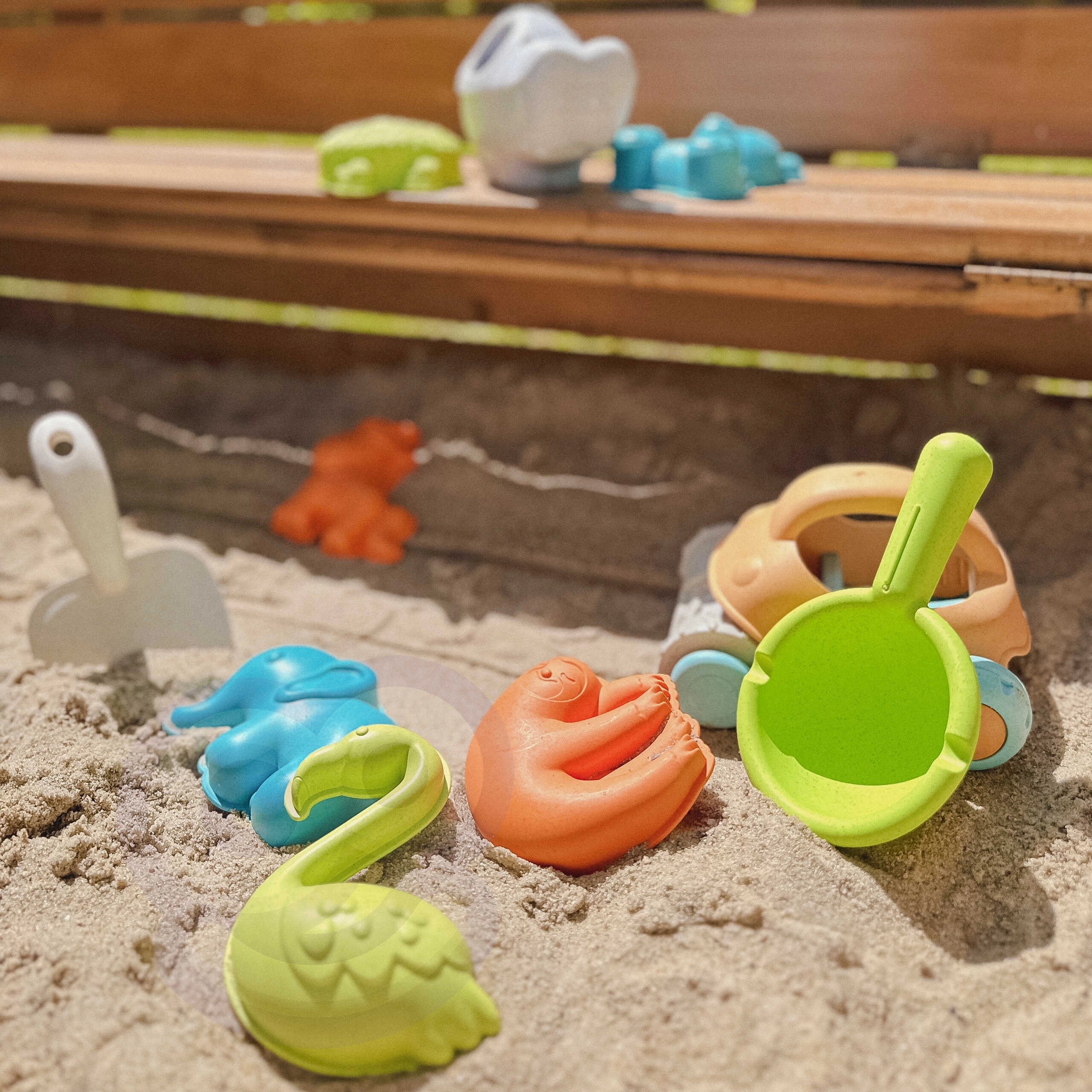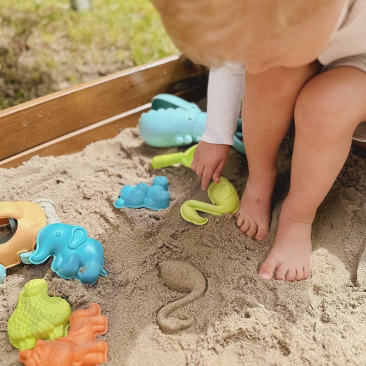 Verschillende dierenvormpjes, schepjes en een zeef stimuleren de verbeelding en ontwikkelen de fijne motoriek bij het bouwen, scheppen en vormen van zand.
