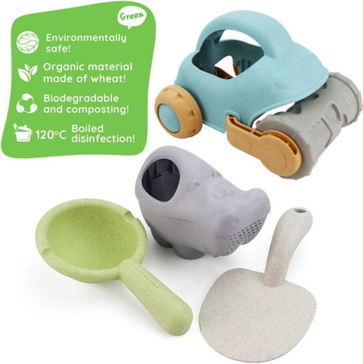 Het materiaal op basis van plantaardige vezels is ecologisch, biologisch afbreekbaar en geschikt voor compostering. De set is gemakkelijk afwasbaar en dankzij de ergonomische grepen ligt hij prettig in kleine handen. Geschikt voor buitenspelen en voor thuis met kinetisch zand.