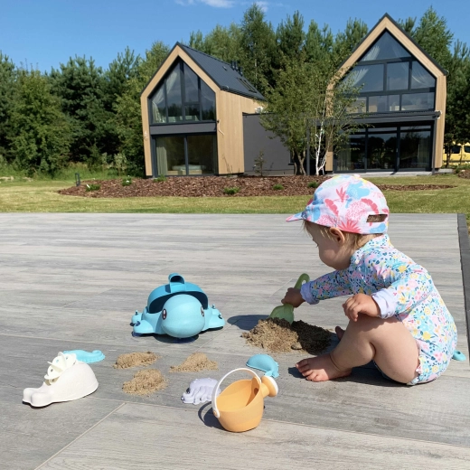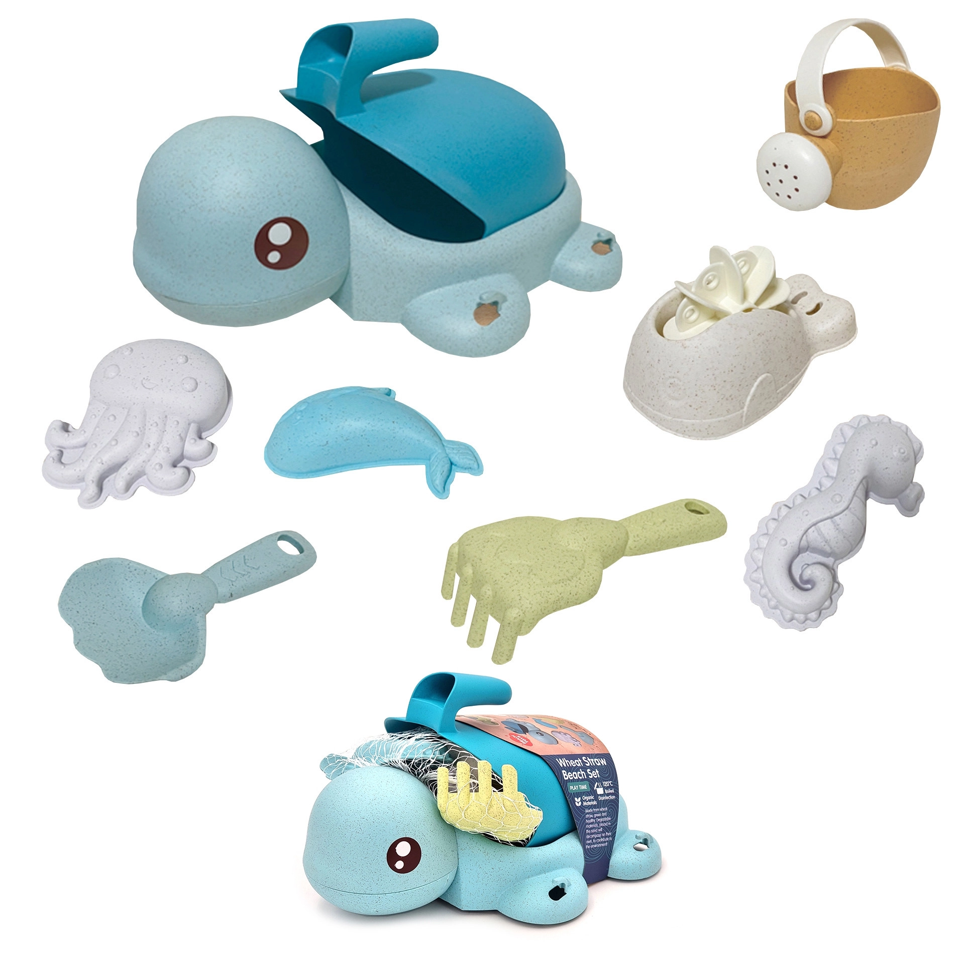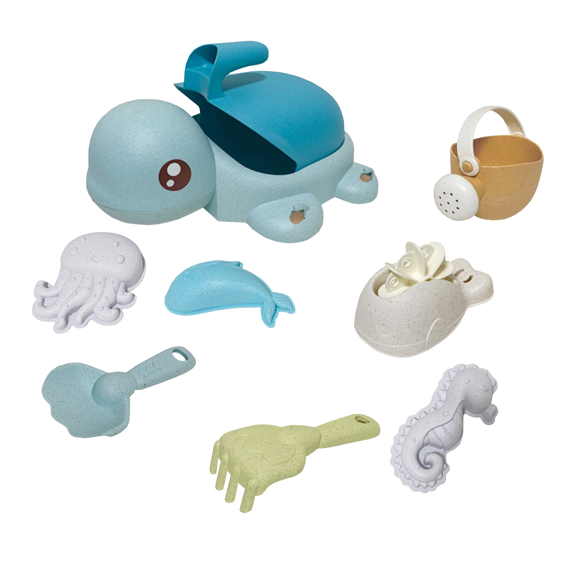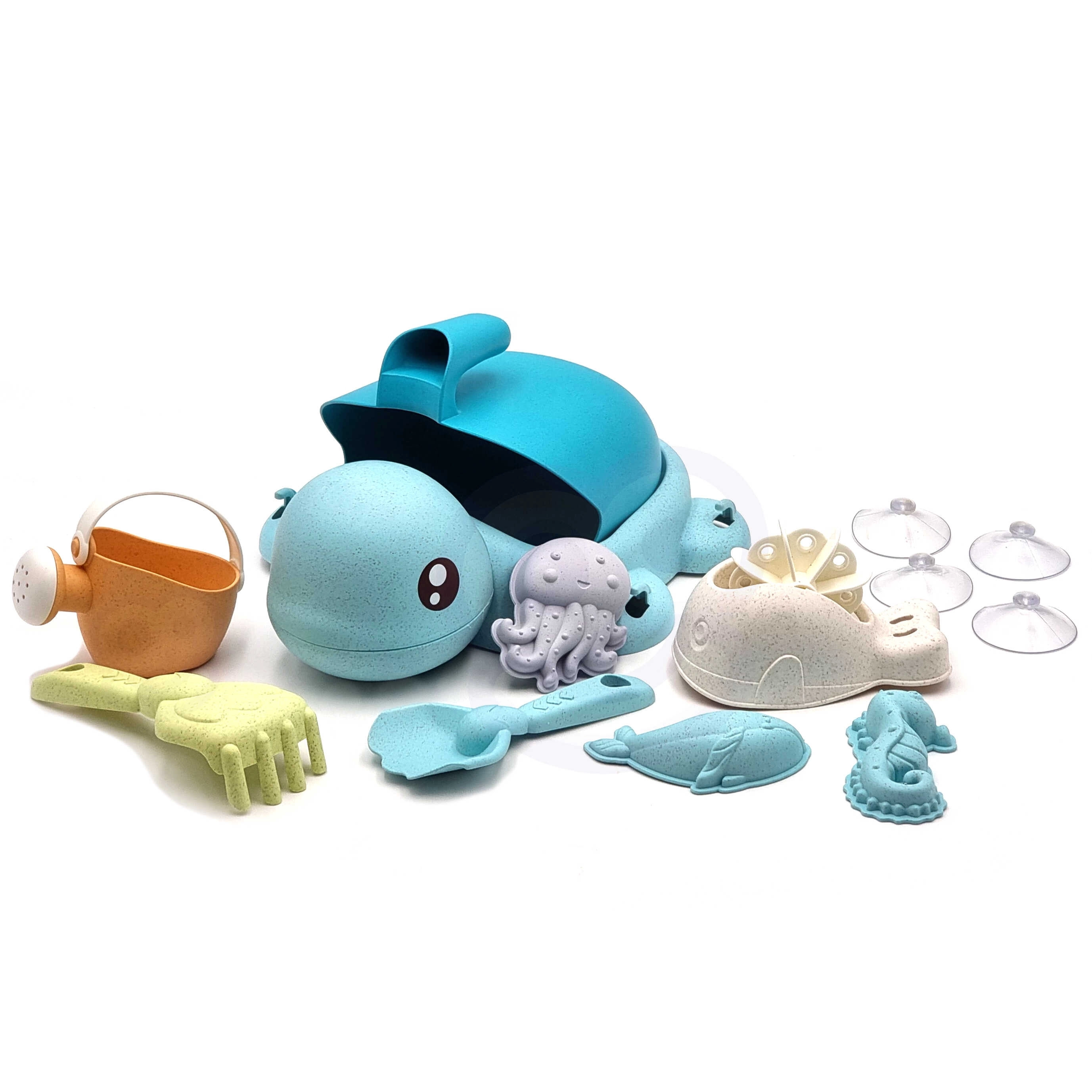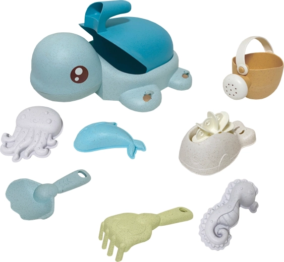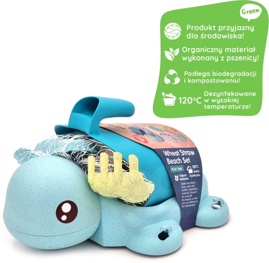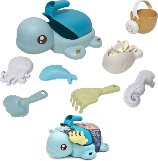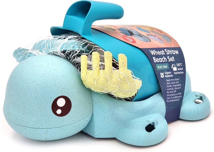 Een schattige schildpad verbergt een complete set voor zand én water – in totaal 8 onderdelen in zachte pasteltinten. Gemaakt van organisch, biologisch afbreekbaar materiaal dat milieuvriendelijk is, veilig voor kinderen en ideaal voor zand, strand, tuin en in bad.