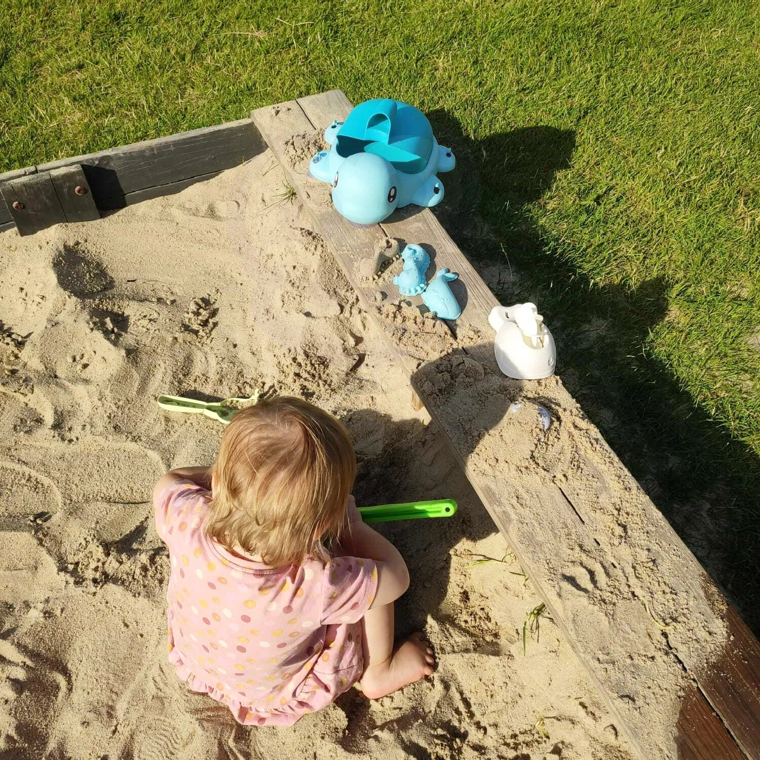 - Schildpad – opbergbox, lepel/pollepel, gieter, 3× vormpje, schep, hark, waterrad met zuignappen