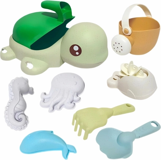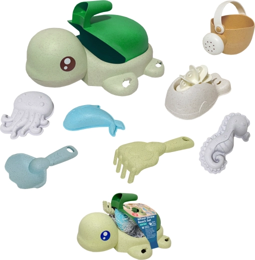 Inhoud van de set: emmer/schildpad met zuignappen, gieter, schep, hark, lepel, rad-molen en 3 vormpjes (zeedieren). Pasteltinten en afgeronde vormen zijn ook vriendelijk voor jongere kinderen vanaf 3 jaar. Het materiaal is biologisch afbreekbaar en composteerbaar, zodat kinderen verantwoord met de natuur spelen.