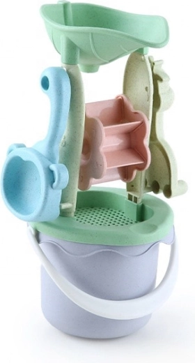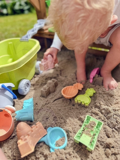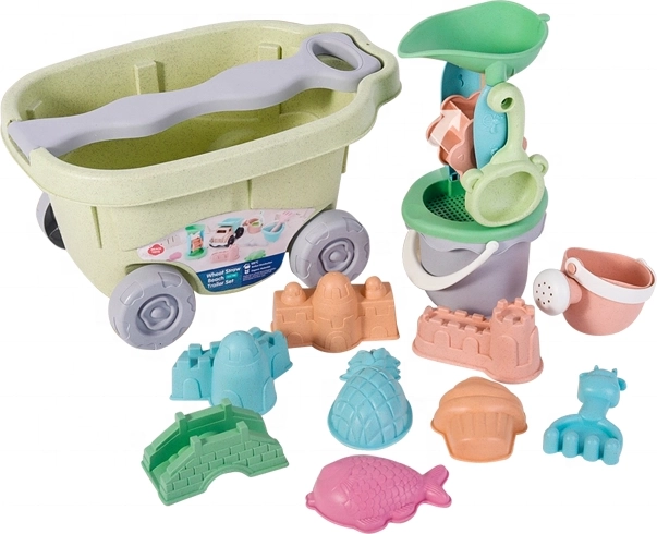 Deze 13-delige zandset met een praktisch wagentje maakt elke kleine bouwer blij. Kinderen kunnen zand vervoeren, zeven, vormen gieten en de water/zandmolen laten draaien. Dankzij de comfortabele handgrepen op de emmer en gieter is de bediening ook voor kleine kinderhanden eenvoudig.
