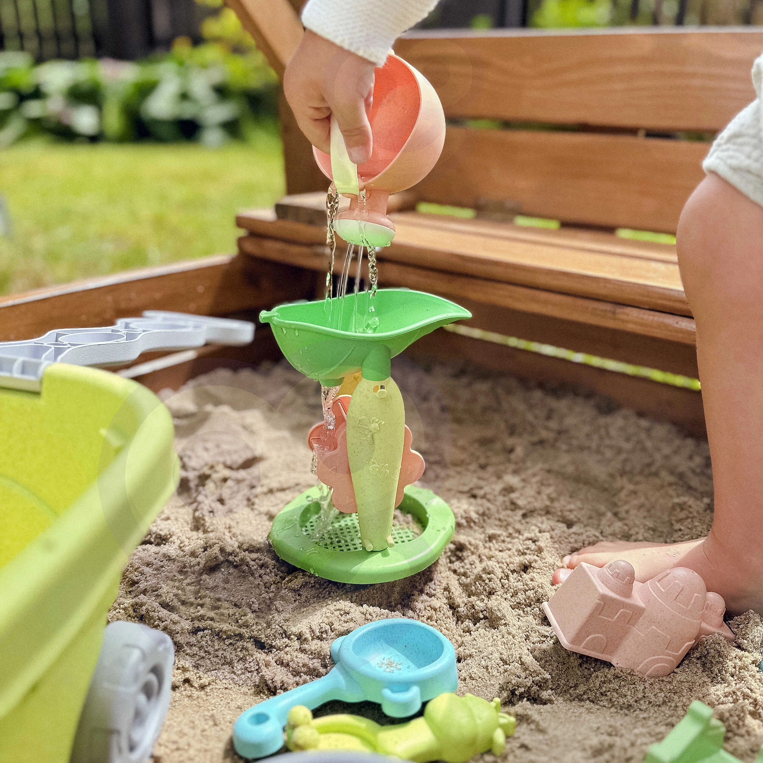Giet zand of water in de trechter en kijk hoe de wieletjes gaan draaien. Het geïntegreerde zeefje helpt zand te reinigen en voegt een speels experimenteer-element toe.