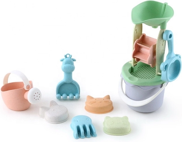 - 9-delige set: emmer, molen met zeef, gieter, 4 vormpjes, schep en hark
