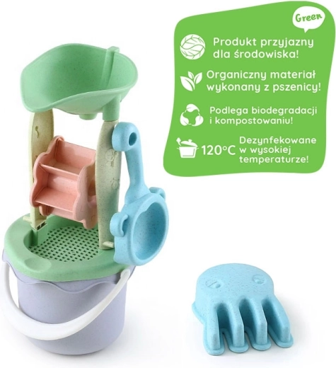 Ontdek milieuvriendelijk speelplezier met de Woopie Green kinderset. Het hart van de set is de molen voor zand en water, die gaat draaien zodra je zand of water toevoegt en het spel verandert in een boeiende activiteit. Het lichte, duurzame ontwerp en de afgeronde vormen zorgen voor veilig en comfortabel gebruik, ook voor de kleinste handjes.