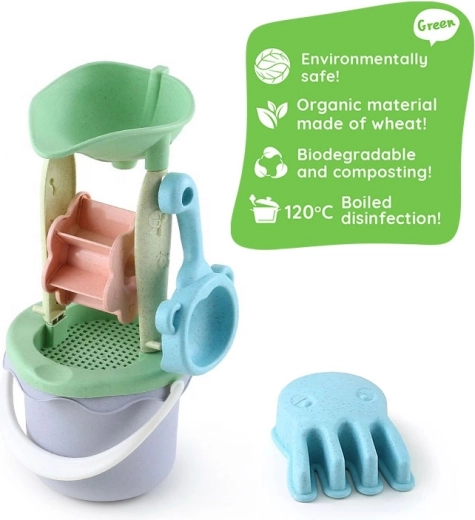 De Woopie Green zandset brengt speelplezier in zand en water in een milieuvriendelijke uitvoering. Bevat 9 onderdelen, waaronder een emmer, molen met zeef, gieter, vormpjes, schep en hark. Alles is gemaakt van organisch en biologisch afbreekbaar materiaal met een pastelontwerp. De onderdelen hebben comfortabele handgrepen en zijn veilig voor kinderen – gedesinfecteerd bij 120 °C. Ideaal voor in de zandbak, op het strand en in de tuin.