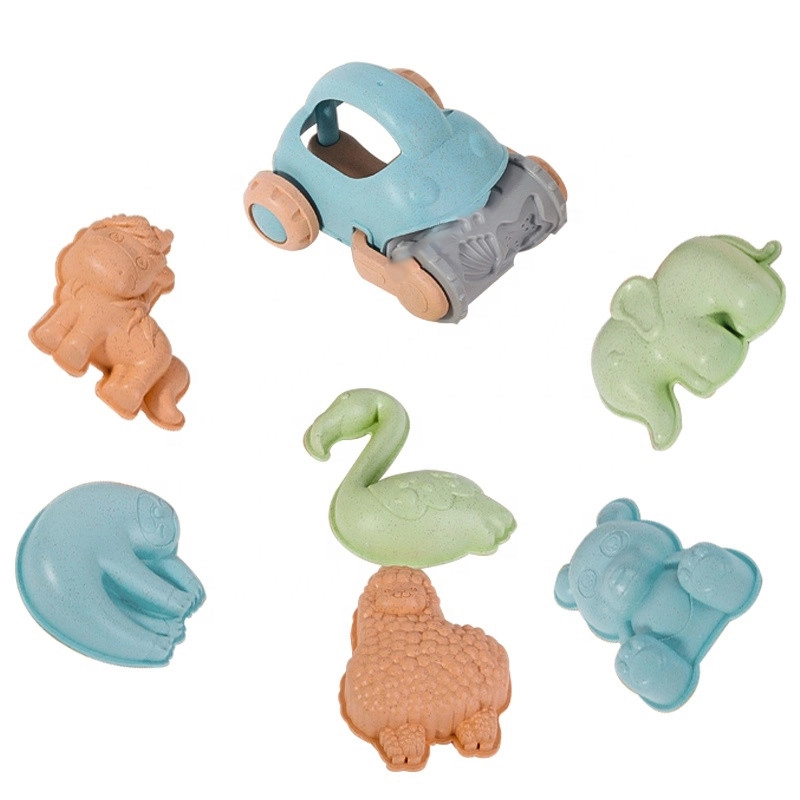 Emmer, schep, hark, 6 vormpjes en een rijdend autootje – alles wat kinderen nodig hebben om kastelen te bouwen en schattige afdrukken in het zand te maken.