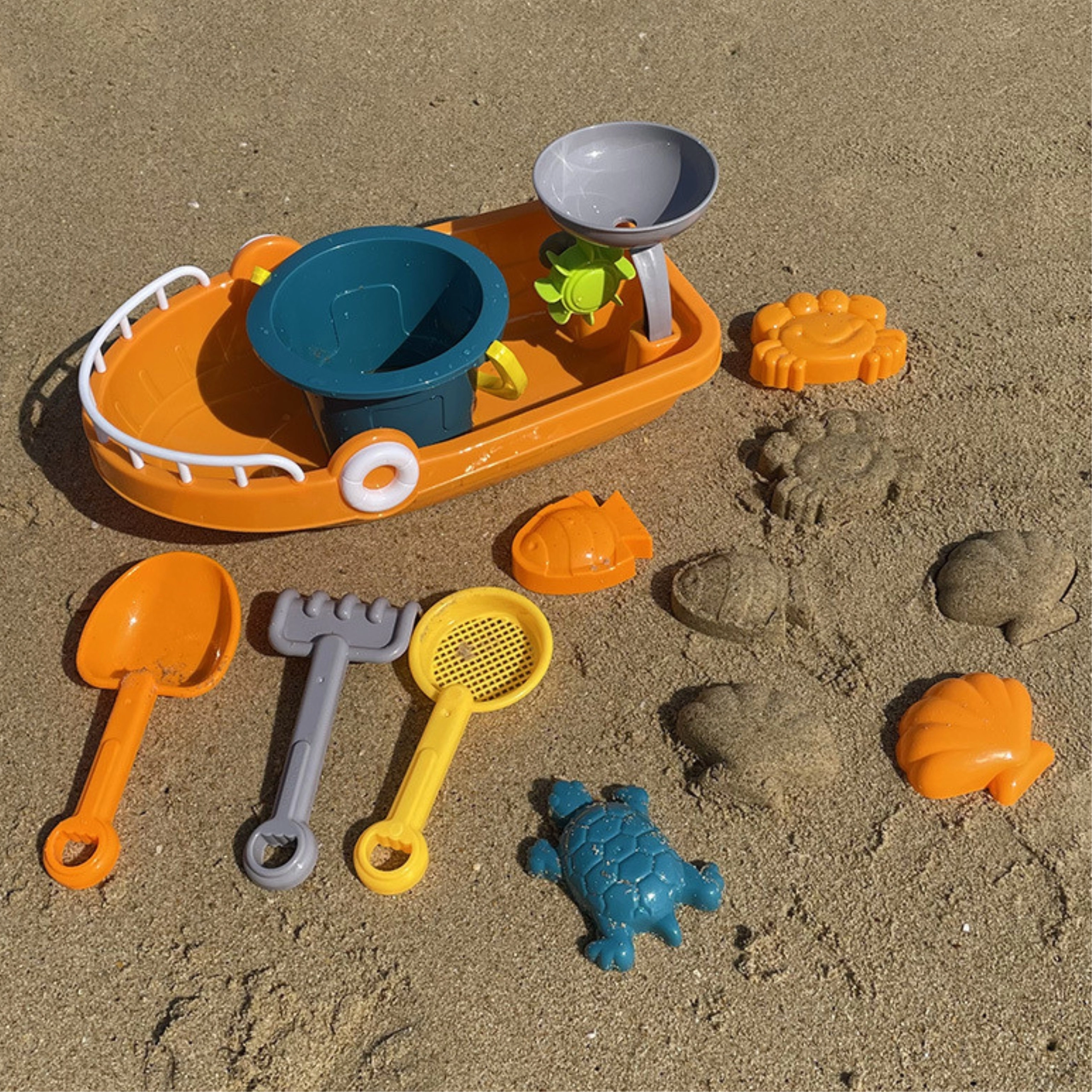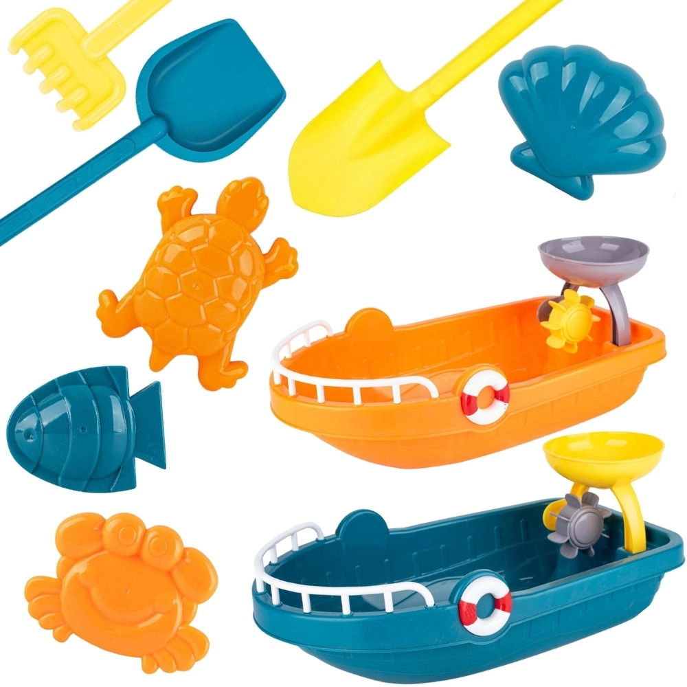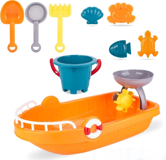 • Inhoud van de set: boot, watermolen met trechter, emmer, 4 vormpjes, hark, zeef, schep