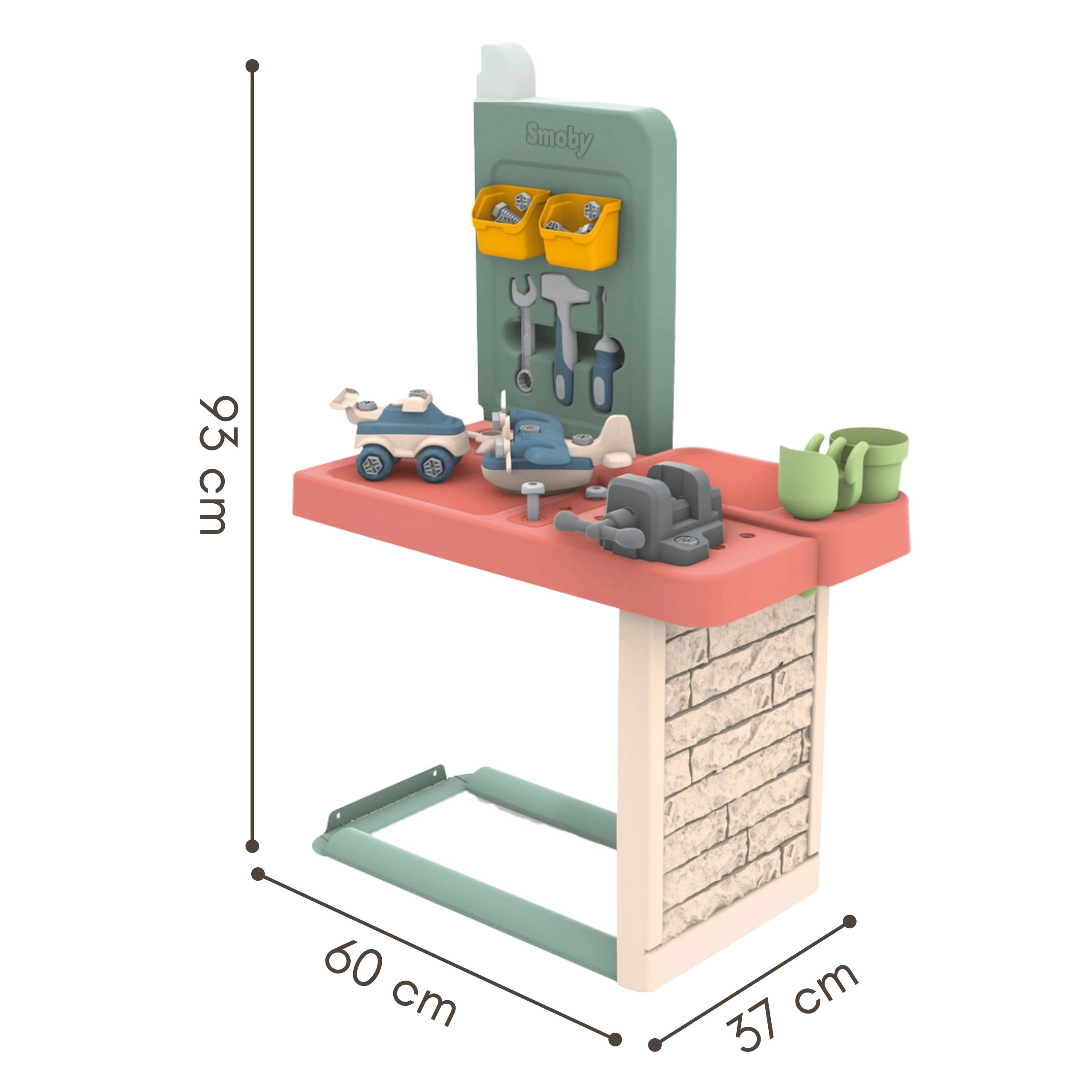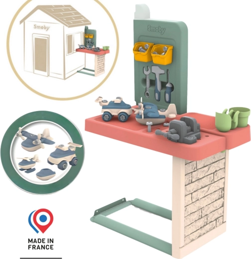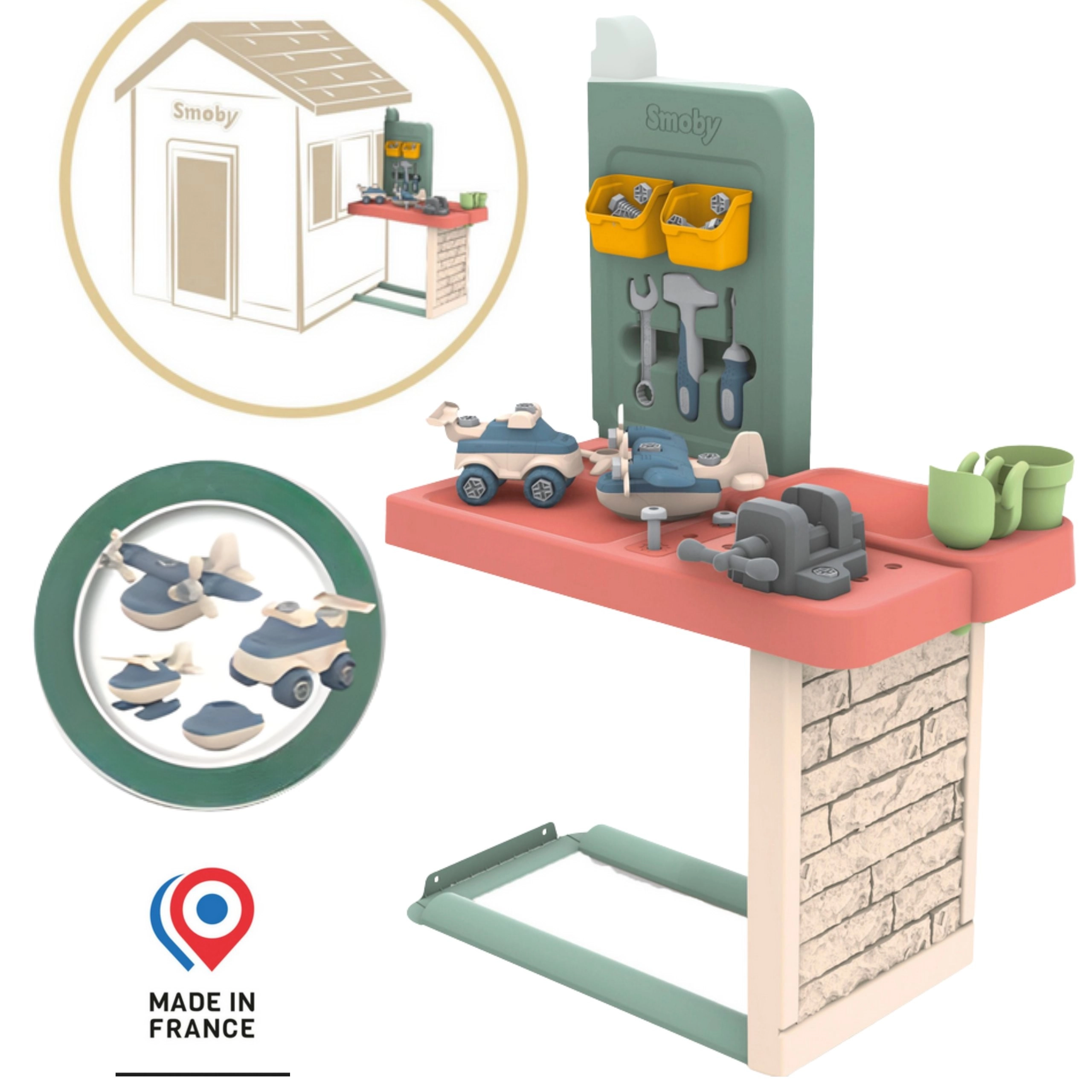 Breid het SMOBY Life kinderhuisje uit met een praktische werkplaatsset met aanbouwtafel en 39 stuks gereedschap en accessoires. Kleine doe-het-zelvers vanaf 2 jaar genieten van veilig monteren, bouwen en nieuwe vaardigheden leren. Compleet met een ruim werkblad, opbergplanken en modellen om te bouwen – een auto en een helikopter. De constructie is UV-bestendig en geproduceerd met een hoog aandeel gerecyclede materialen voor langdurig speelplezier binnen en buiten.