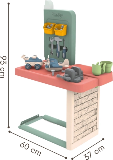 Deze aanbouw-werkbank is de ideale aanvulling op de modulaire SMOBY Life huisjes. Dankzij de doordachte indeling en de uitgebreide set tools kunnen kinderen veilig de wereld van klussen ontdekken en zo hun fijne motoriek, coördinatie en logisch denken ontwikkelen. Het brede werkblad en de opbergplanken houden alles op zijn plek, zodat het spel overzichtelijk en leuk blijft.
