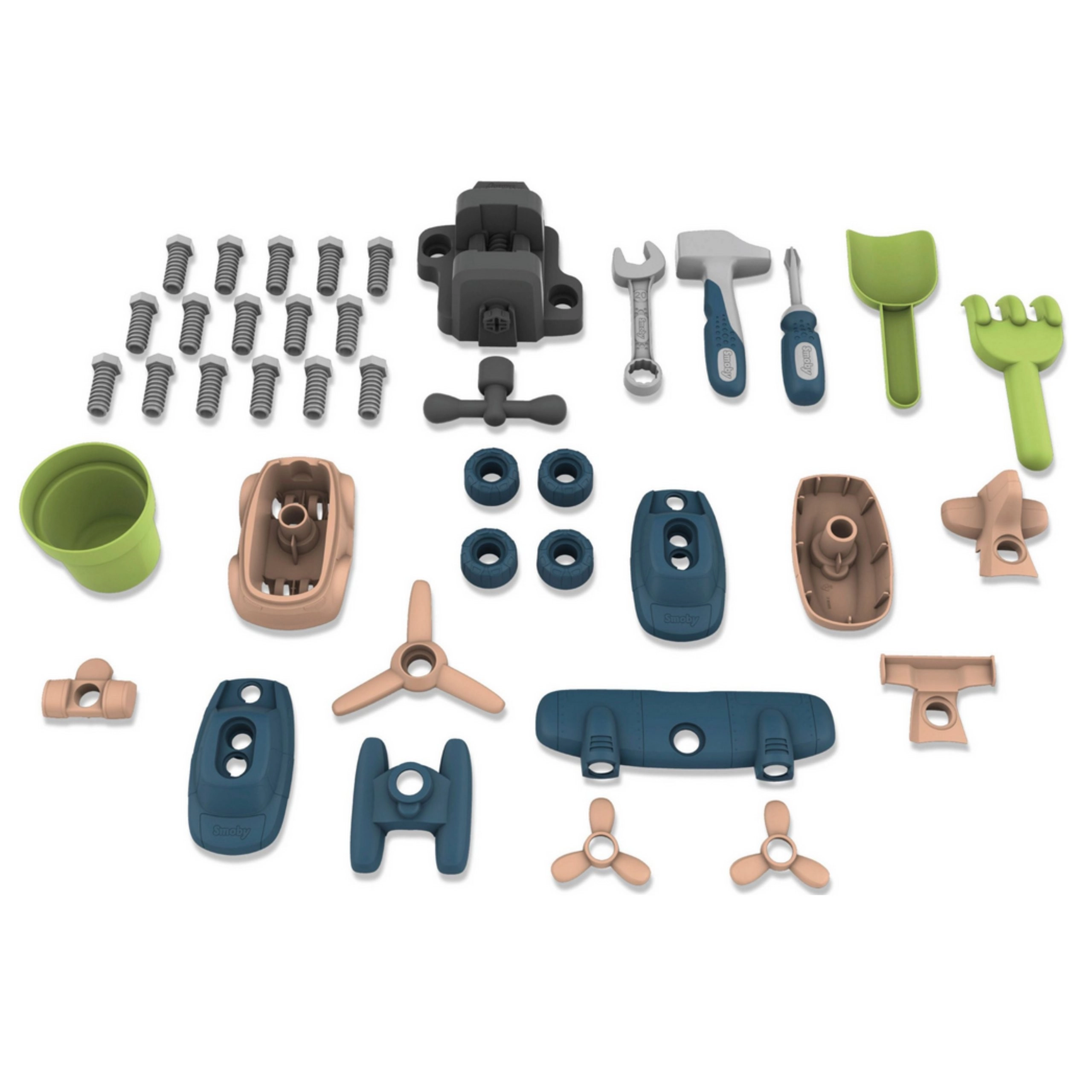 De set bevat 39 onderdelen, waaronder een hamer, schroevendraaier, sleutels en bevestigingsmateriaal. Kinderen kunnen zelf een auto en een helikopter monteren en zo geduld, precisie en een gevoel van succes trainen. Het materiaal is duurzaam, UV-stabiel en bevat een hoog aandeel gerecycled materiaal – perfect voor langdurig gebruik in de tuin en in huis.