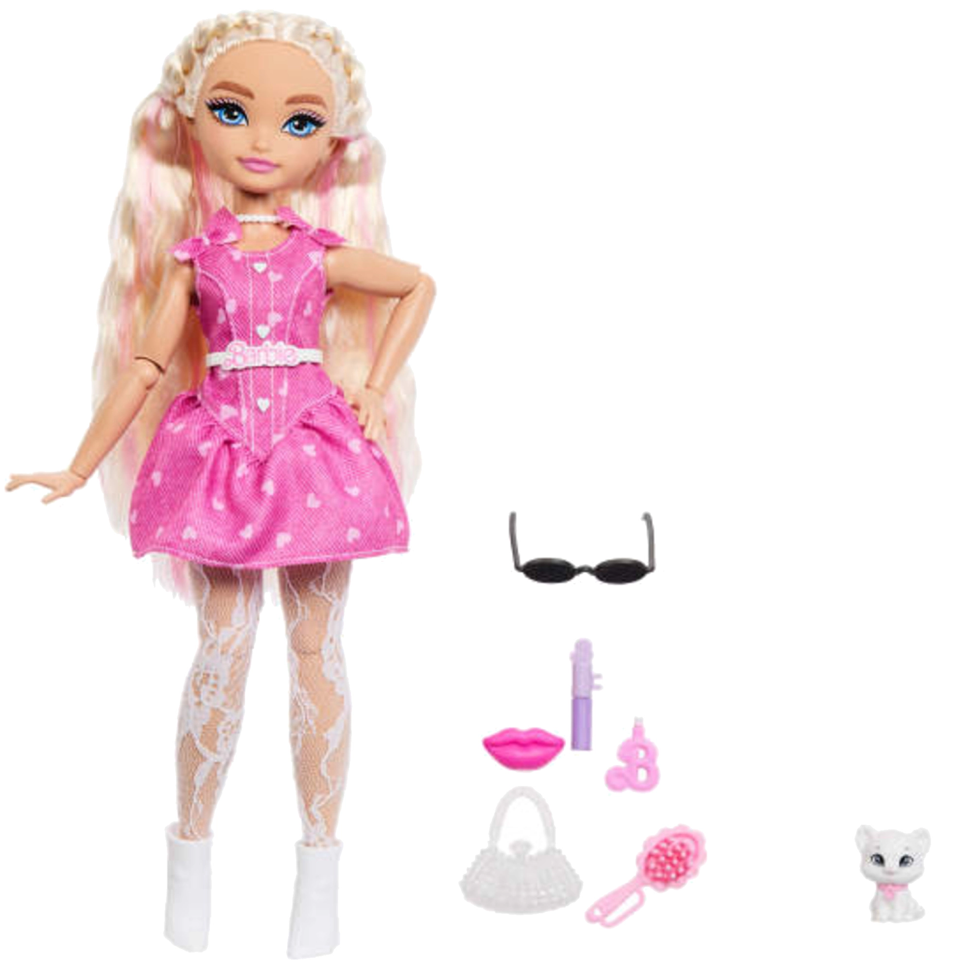 De BARBIE Dream Besties Malibu is meer dan alleen een modieuze toevoeging aan de kinderkamer – het is de beste vriendin voor creatief spel. Dankzij de gewrichten om te poseren neemt ze eenvoudig verschillende poses aan en haar lange golvende haar met vlechtjes nodigt uit tot eindeloze kapsels. De afneembare outfit met een jurk met hartjes, kantpanty’s en stijlvolle schoenen geeft elke scène een modieuze touch.