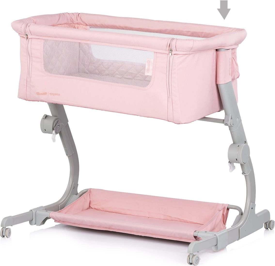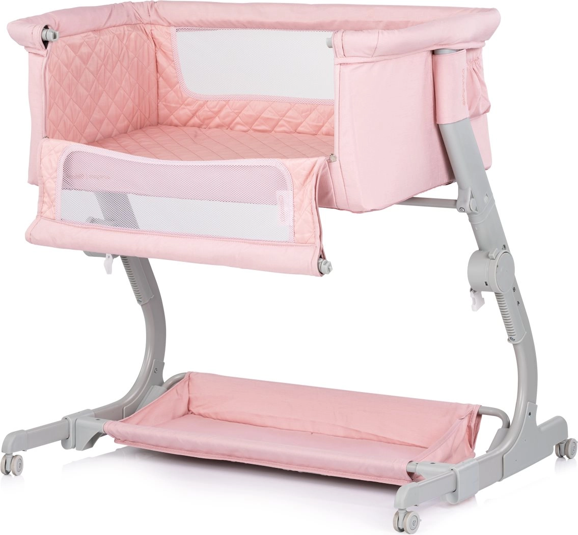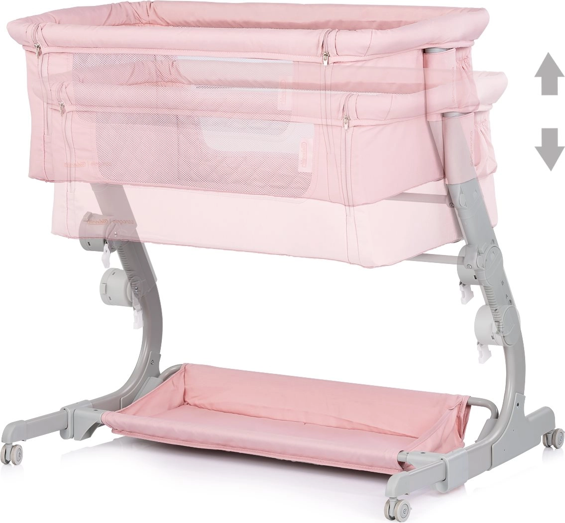 Praktisch kinderbedje en 2-in-1 co-sleeper CHIPOLINO Eleganza in een zachte roze tint biedt je baby een veilige en knusse plek om te slapen en te rusten. Dankzij 3 hoogtestanden, mesh-zijpanelen voor zicht en luchtcirculatie, vergrendelbare wieltjes en een lichte maar stabiele metalen constructie is het ideaal voor dagelijks gebruik én reizen – inclusief een compacte reistas.