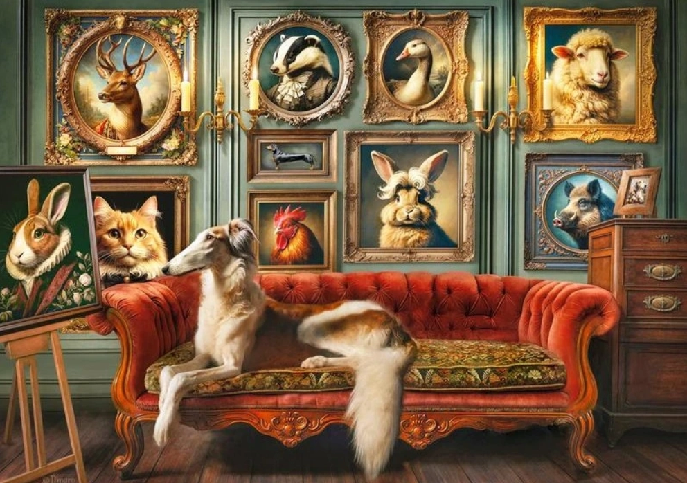 Ontdek het elegante motief “Aristocratische menagerie”, dat subtiele humor combineert met gedetailleerde uitwerking. De puzzel met 1000 stukjes is een uitstekende keuze voor zowel beginners als gevorderden die op zoek zijn naar een gebalanceerde uitdaging en hoogwaardige afwerking. Na het leggen krijg je een afbeelding van ongeveer 70 × 50 cm, geschikt om in te lijsten en tentoon te stellen.