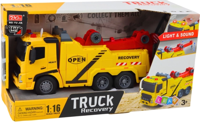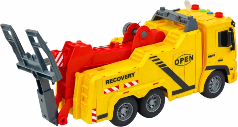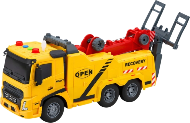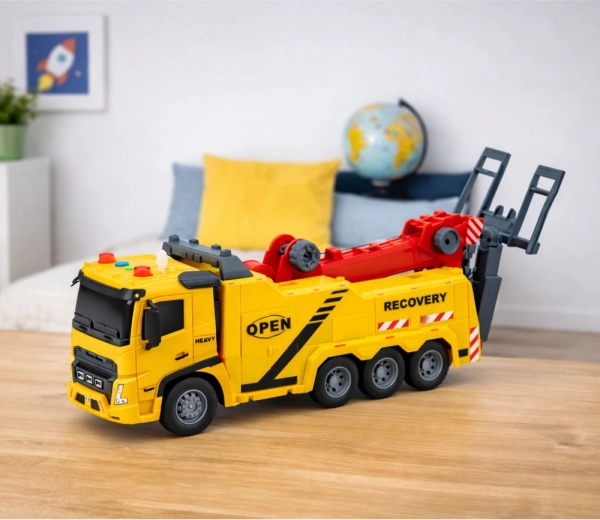 De sleepwagen in helder geel met rode accenten ziet eruit als echte wegassistentie. Kinderen genieten van authentiek spel dankzij de functionele arm met haak, het kantelbare platform en de knoppen op het dak die lichten en geluiden activeren. Het model stimuleert fantasie, fijne motoriek en oog-handcoördinatie.