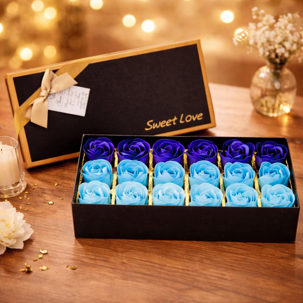 Elegante flowerbox met een compositie van geurende decoratieve rozen in blauwtinten; een kant‑en‑klare gift én een stijlvolle interieurdecoratie. De rozen bootsen echte bloemen natuurgetrouw na, hebben geen water of verzorging nodig en behouden langdurig hun esthetische uitstraling en subtiele geur. Dankzij de luxueuze cadeauverpakking ideaal voor verjaardagen, jubilea, naamdagen en voor Valentijn of Vrouwendag.