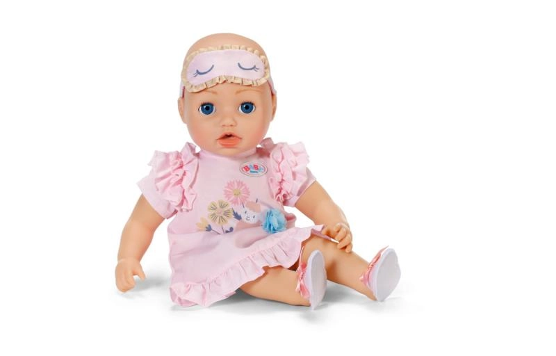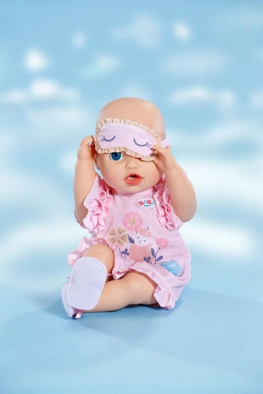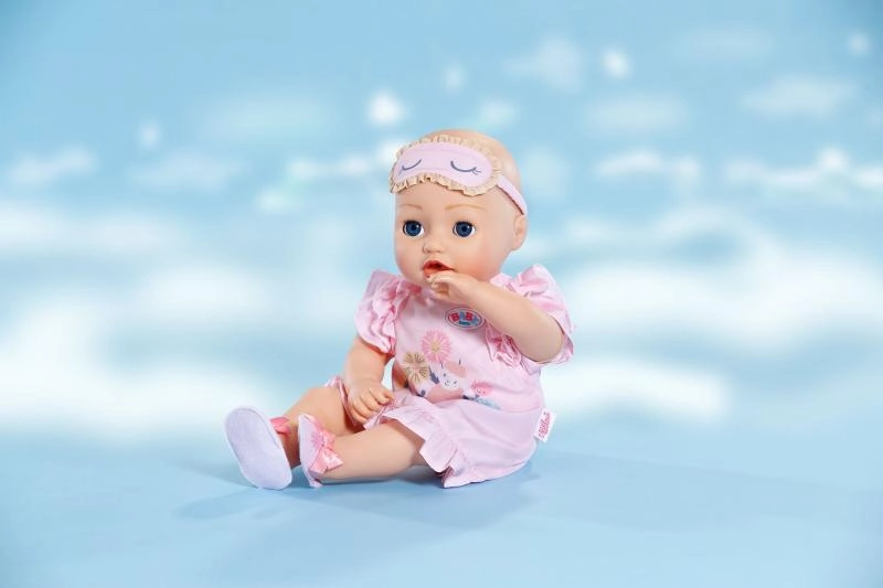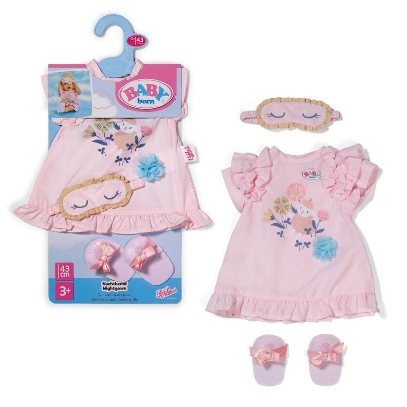 Schattige set voor het avondritueel van poppen: een zachte nachtjapon met ruches, comfortabele pantoffeltjes en een slaapmasker. Speels design met zachte motieven en pasteltinten maakt het de ideale outfit voor realistisch naar-bed-brengen van poppen van 43 cm en ook voor de BABY born-knuffelbeer.