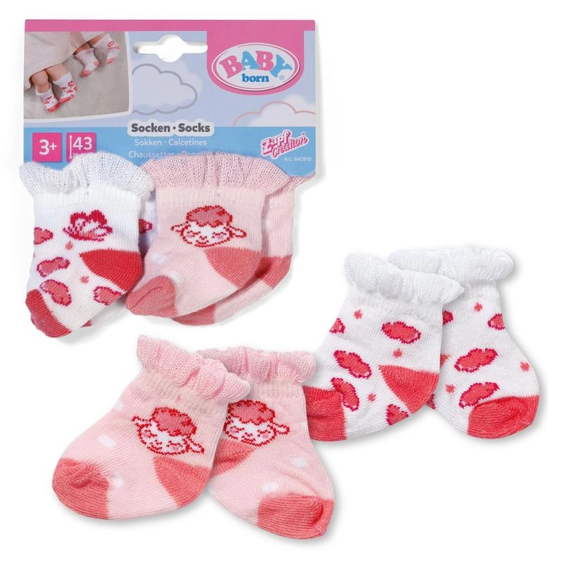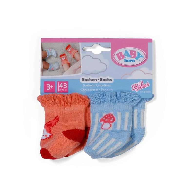 Elke verpakking bevat 2 paar in bijpassende kleuren met lieve prints. Kies uit twee varianten: een zachte, speelse set met een schaapje en vlinder, of een opvallendere combinatie met een vosje en vliegenzwam. De sokken vormen een mooie aanvulling op de garderobe van alle BABY born outfits en stimuleren de fantasie tijdens het spelen.