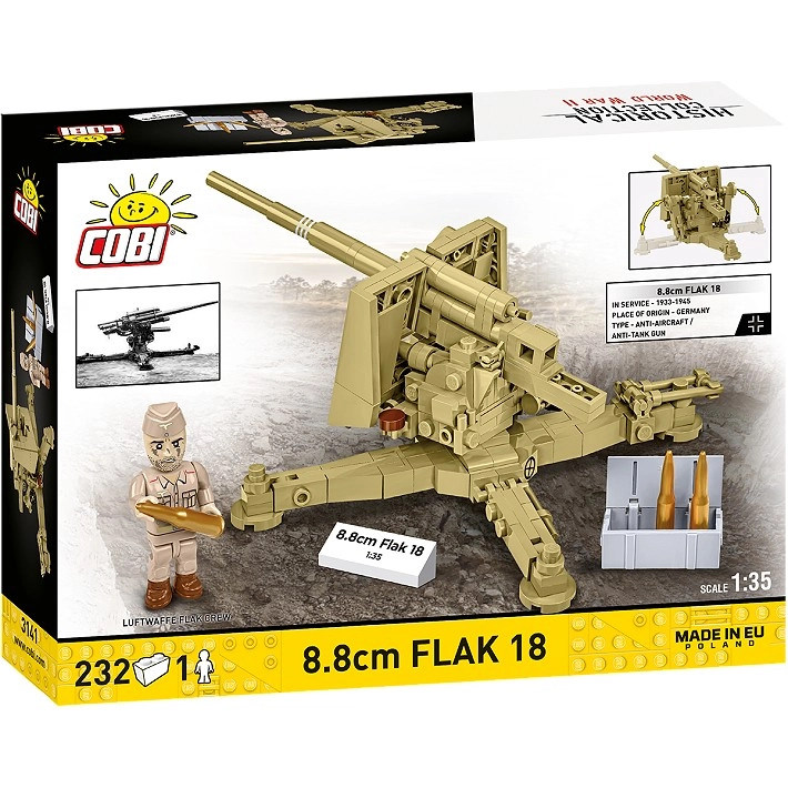 Bouw het iconische kanon 8,8 cm Flak 18 in realistische 1:35-schaal. De bouwset bevat 232 onderdelen, gedetailleerde bewegende elementen (elevatie, 360° rotatie, neerklapbare steunen), een minifiguur van een artillerist en verzamelaccessoires. Ideaal voor fans van historische modellen, voor display en actief speelplezier.