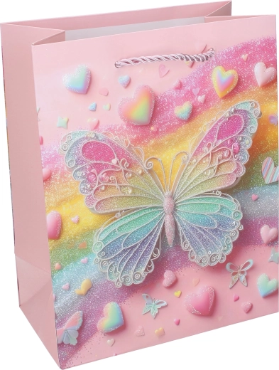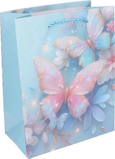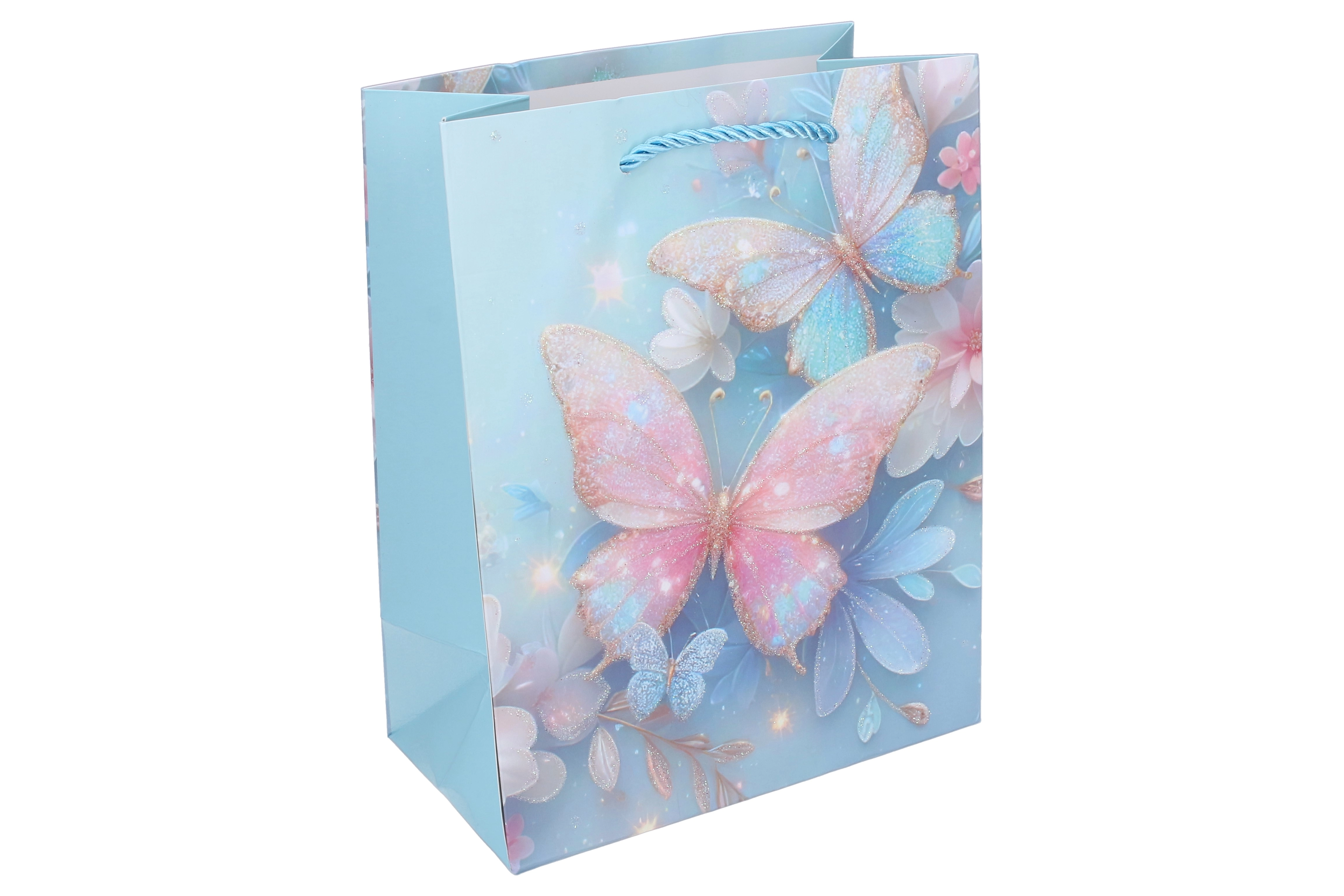 Dankzij de stevige papieren constructie, de verstevigde bodem en de gedraaide koordhandvatten is de tas comfortabel en betrouwbaar om te dragen. Glanzende en sprankelende accenten op de vlinders geven het cadeau een bijzondere uitstraling die zowel kinderen als hun ouders zal bekoren.