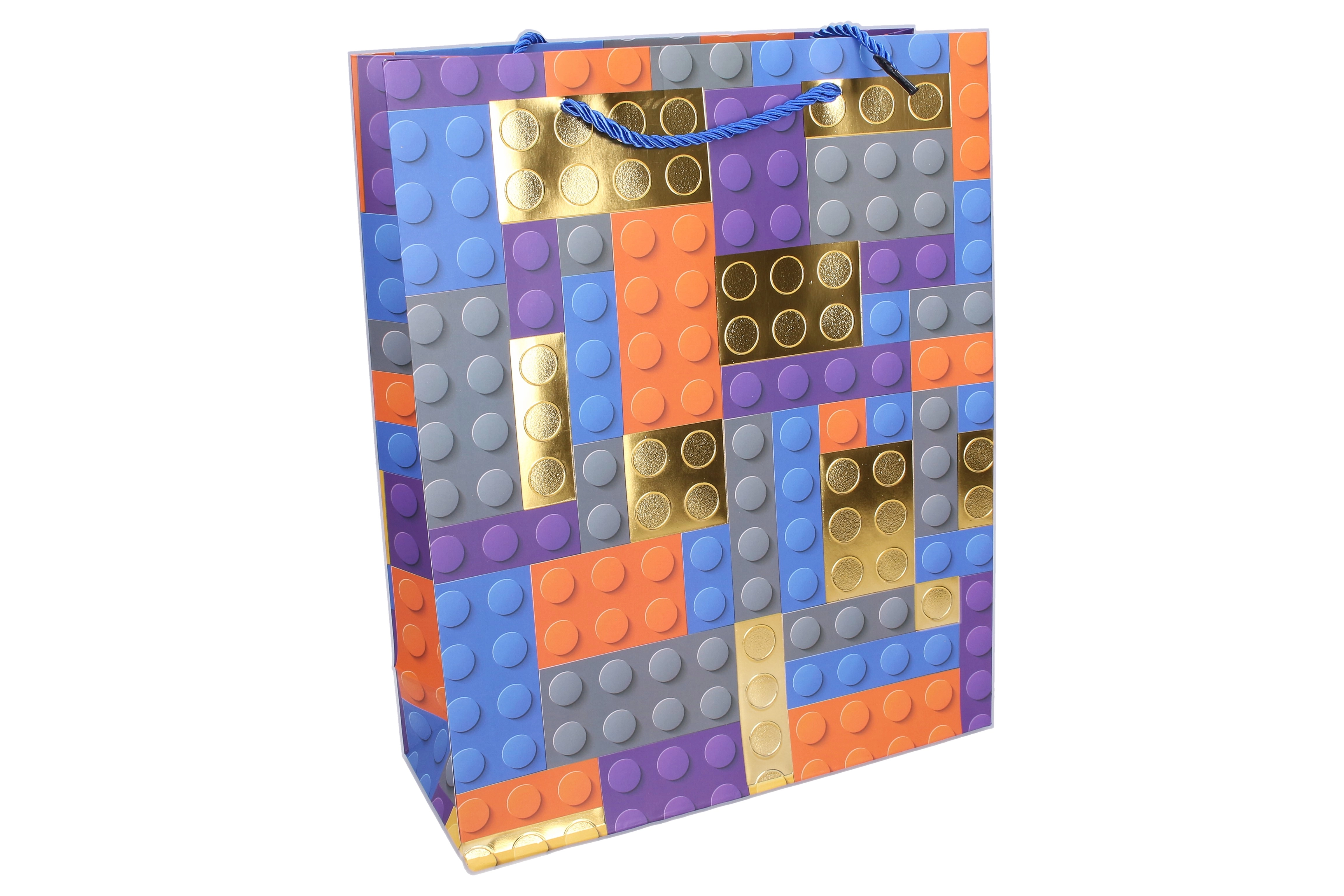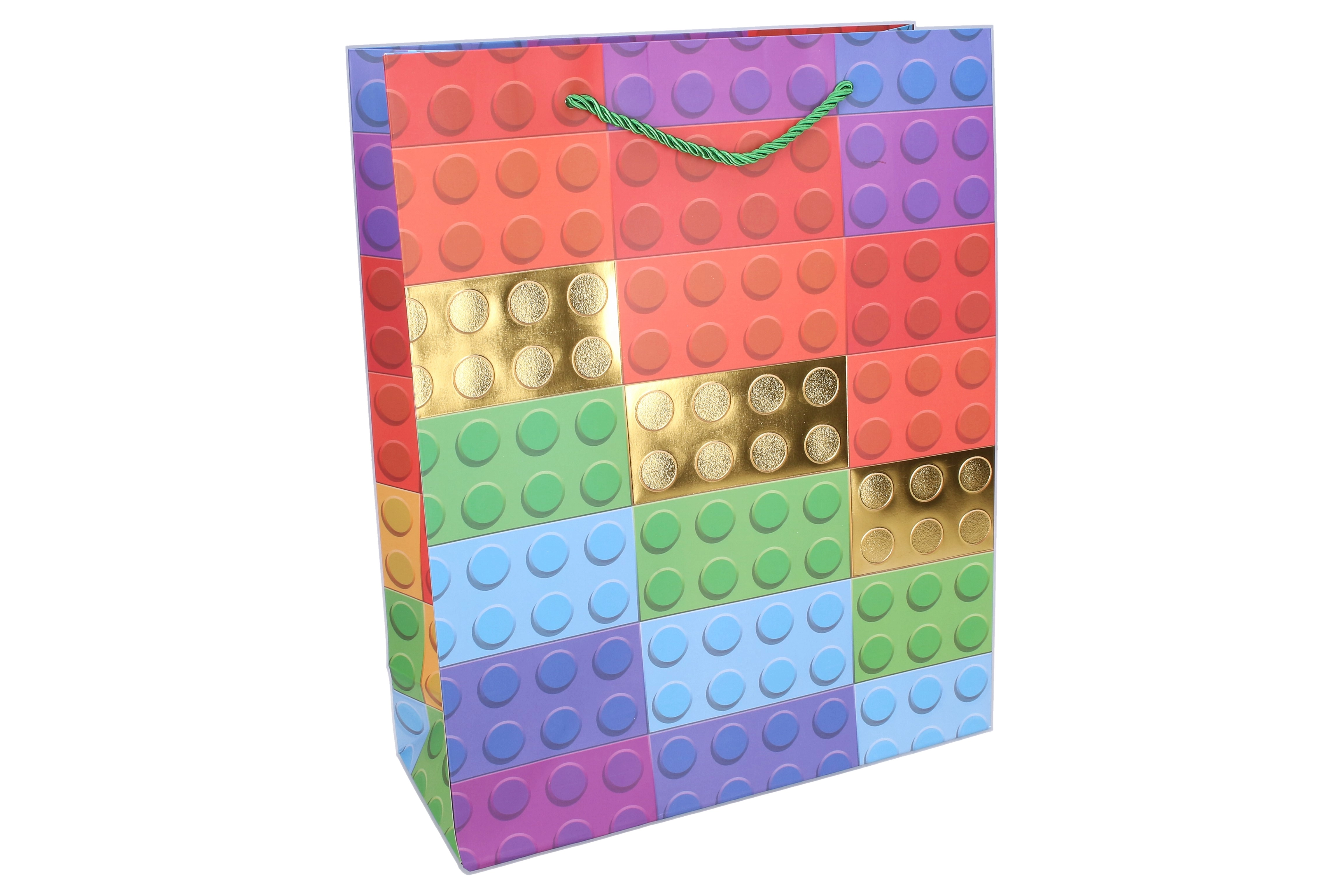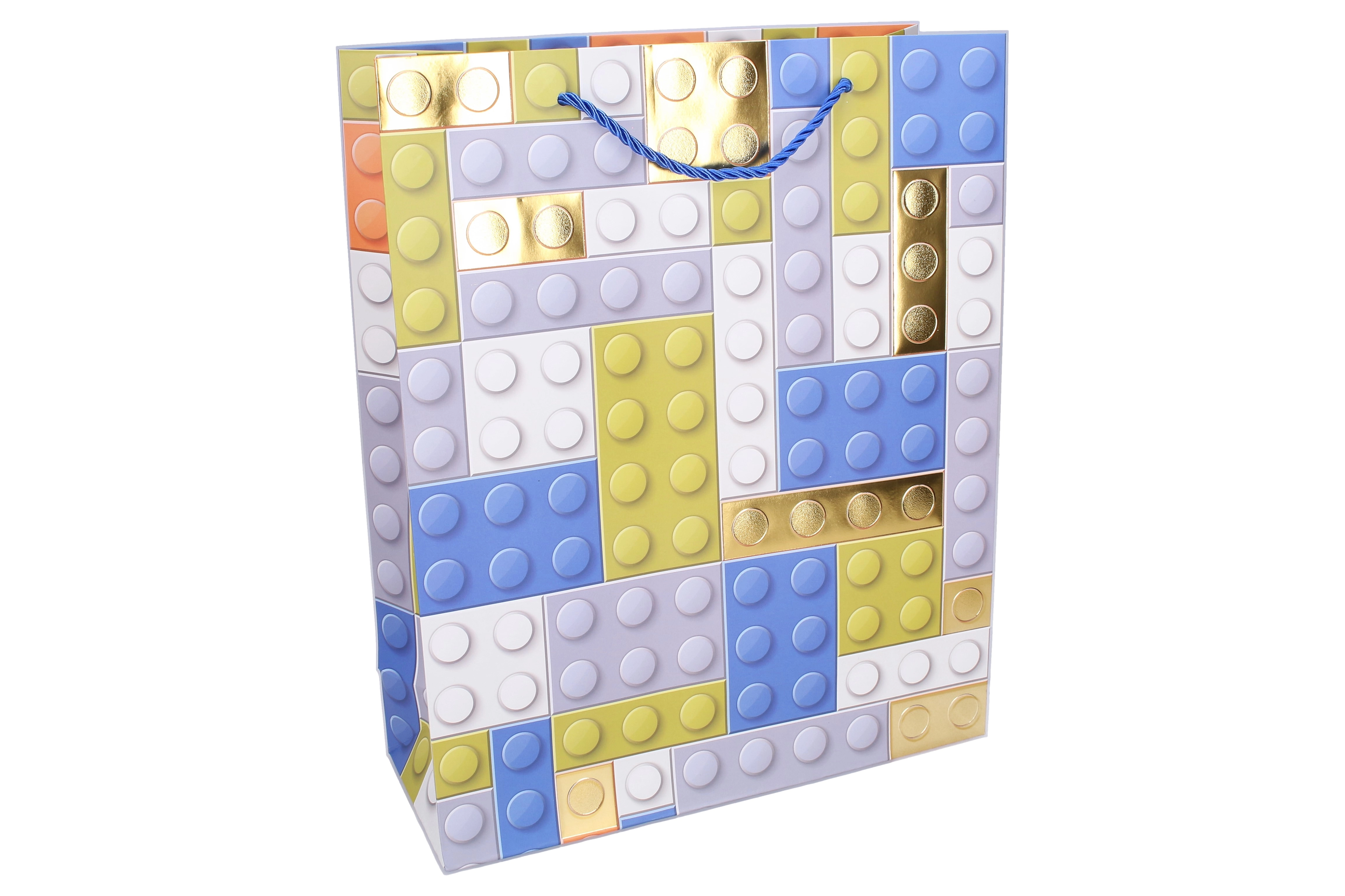 Stijlvolle cadeautas voor kinderen in maat L (31 × 40 × 12 cm) met bouwstenenmotief, leuk voor jong en oud. Voorzien van een stevig koordhandvat, hoogwaardige papieren afwerking en glanzende gouden accenten voor een feestelijke look. Een uitstekende keuze voor verjaardagen, feesten en feestdagen.