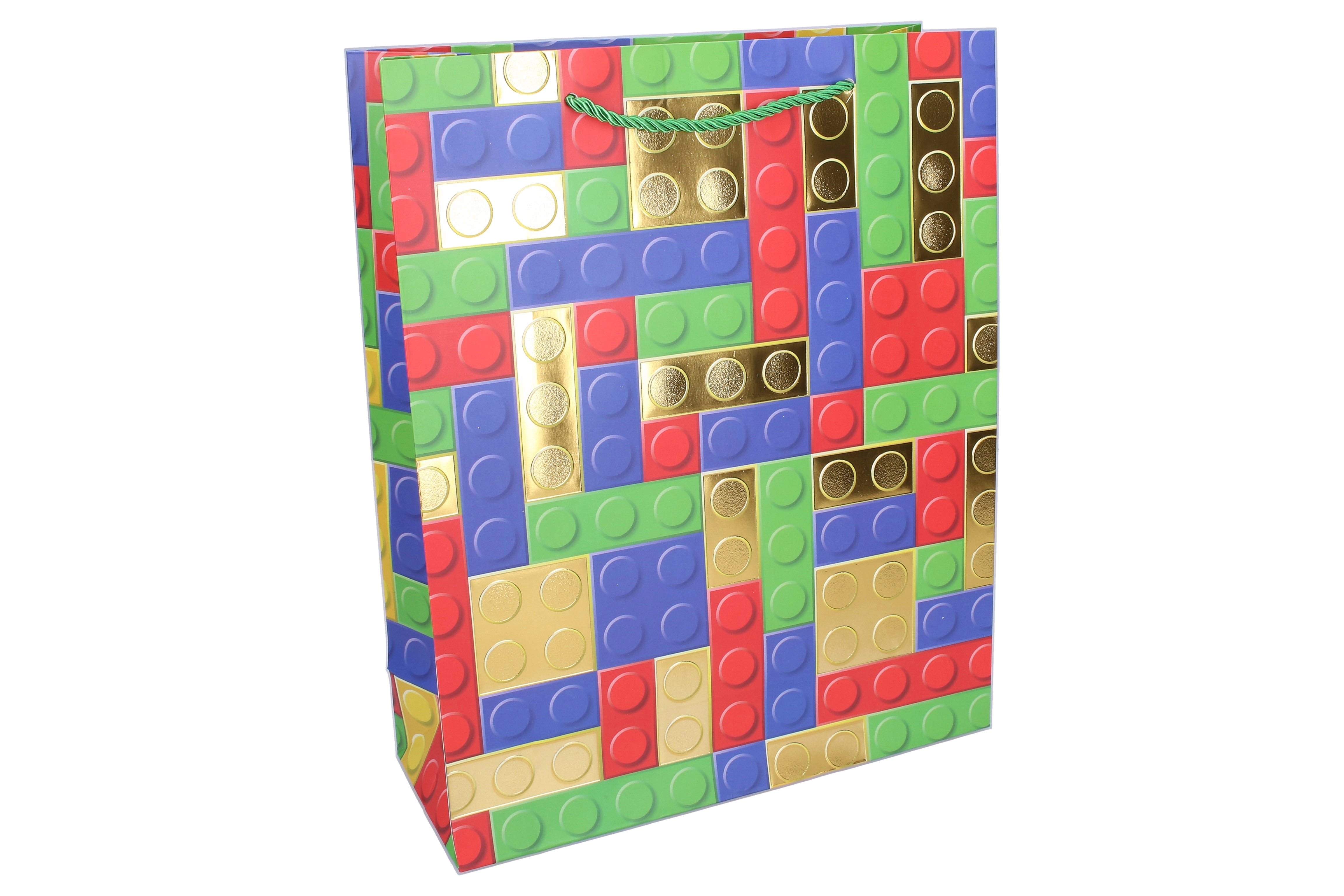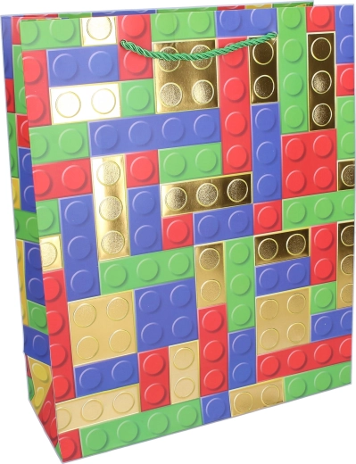 Stijlvolle cadeautas in maat M (26 × 32 × 10 cm) met een speels bouwblokmotief, leuk voor zowel kinderen als volwassenen. Dankzij de stevige papieren constructie, getwijnde koordhandvatten en glanzende gouden accenten is hij ideaal voor veilig en opvallend inpakken van cadeaus. Verkrijgbaar in 4 kleurvarianten.