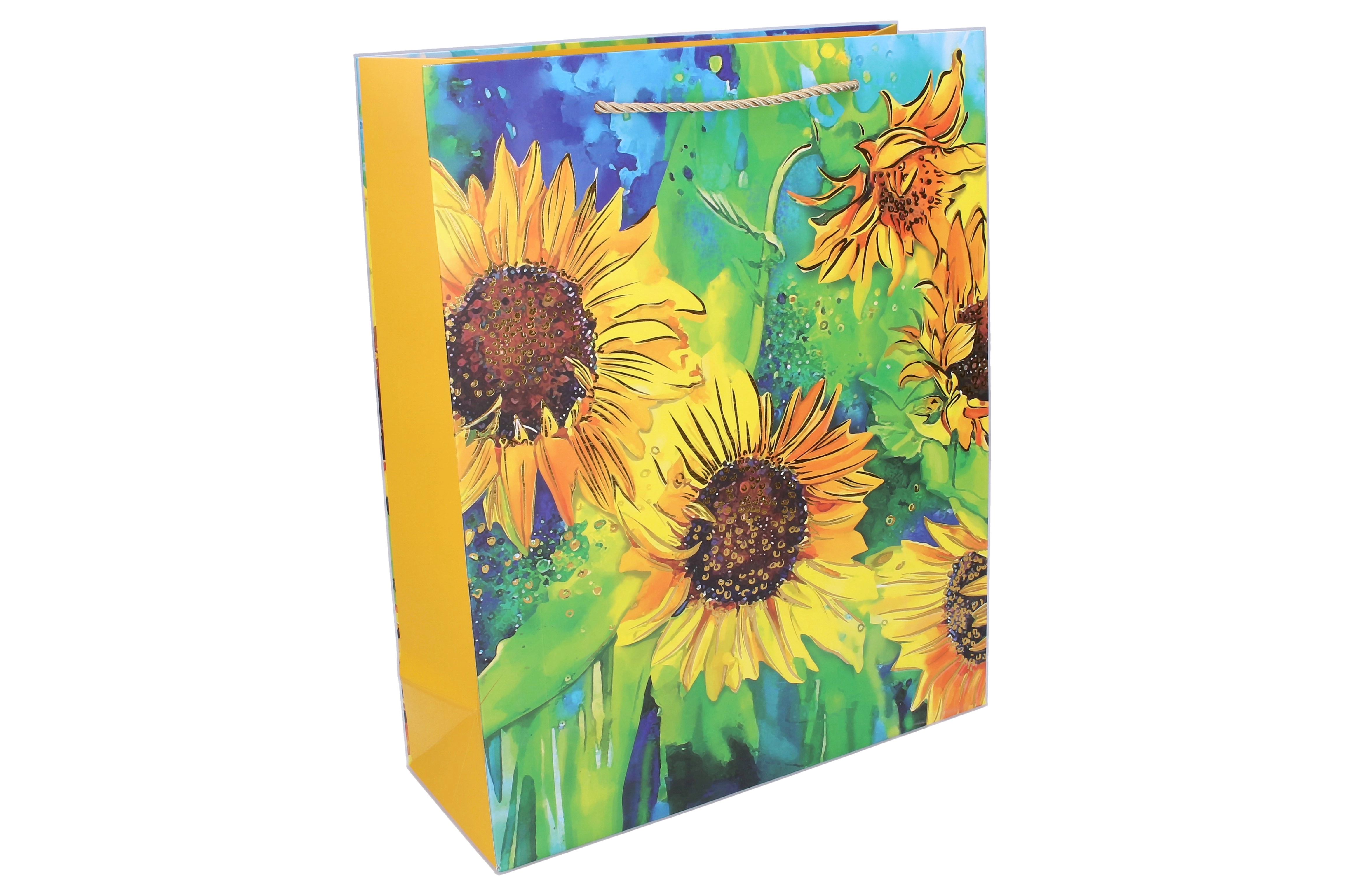 Elegante cadeautas in maat M met afmetingen 26 × 32 × 10 cm en bloemenmotieven, ideaal voor het hele jaar door cadeaus geven. Heeft een glanzend oppervlak, een stevig koordhandvat en duurzame papieren uitvoering voor een veilige en stijlvolle overdracht van cadeaus. Verkrijgbaar in 4 aantrekkelijke varianten met bloemendessin.