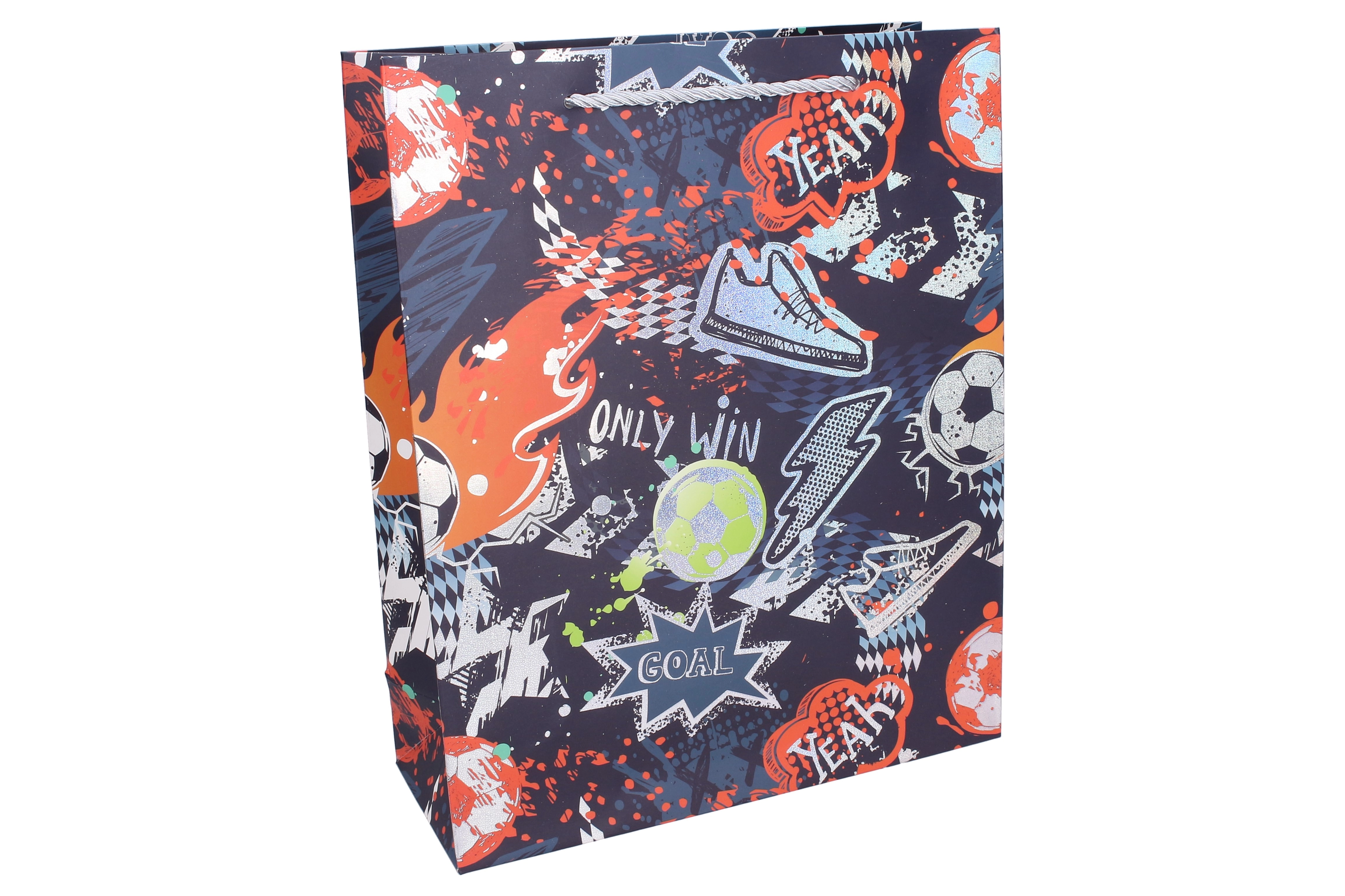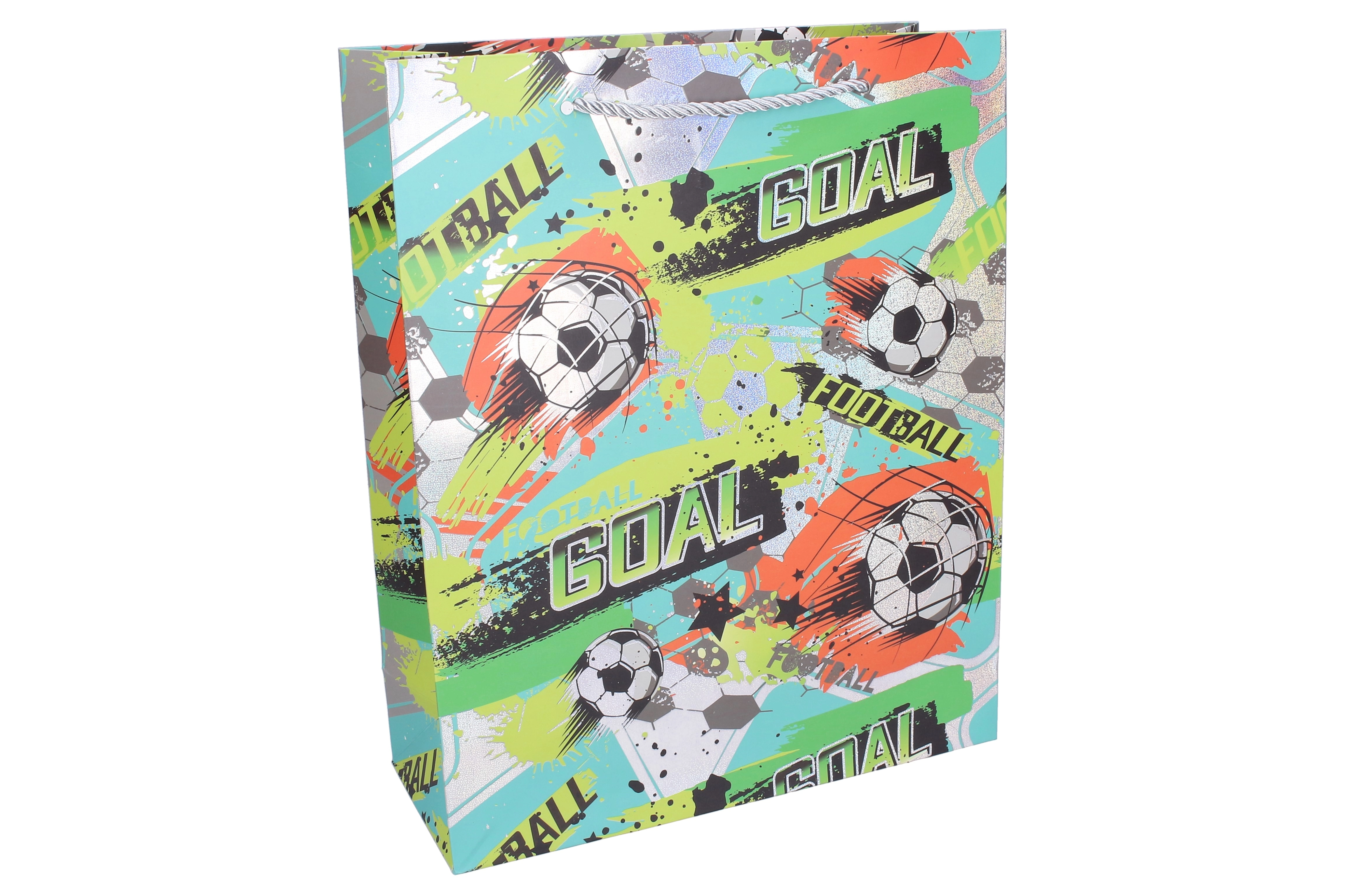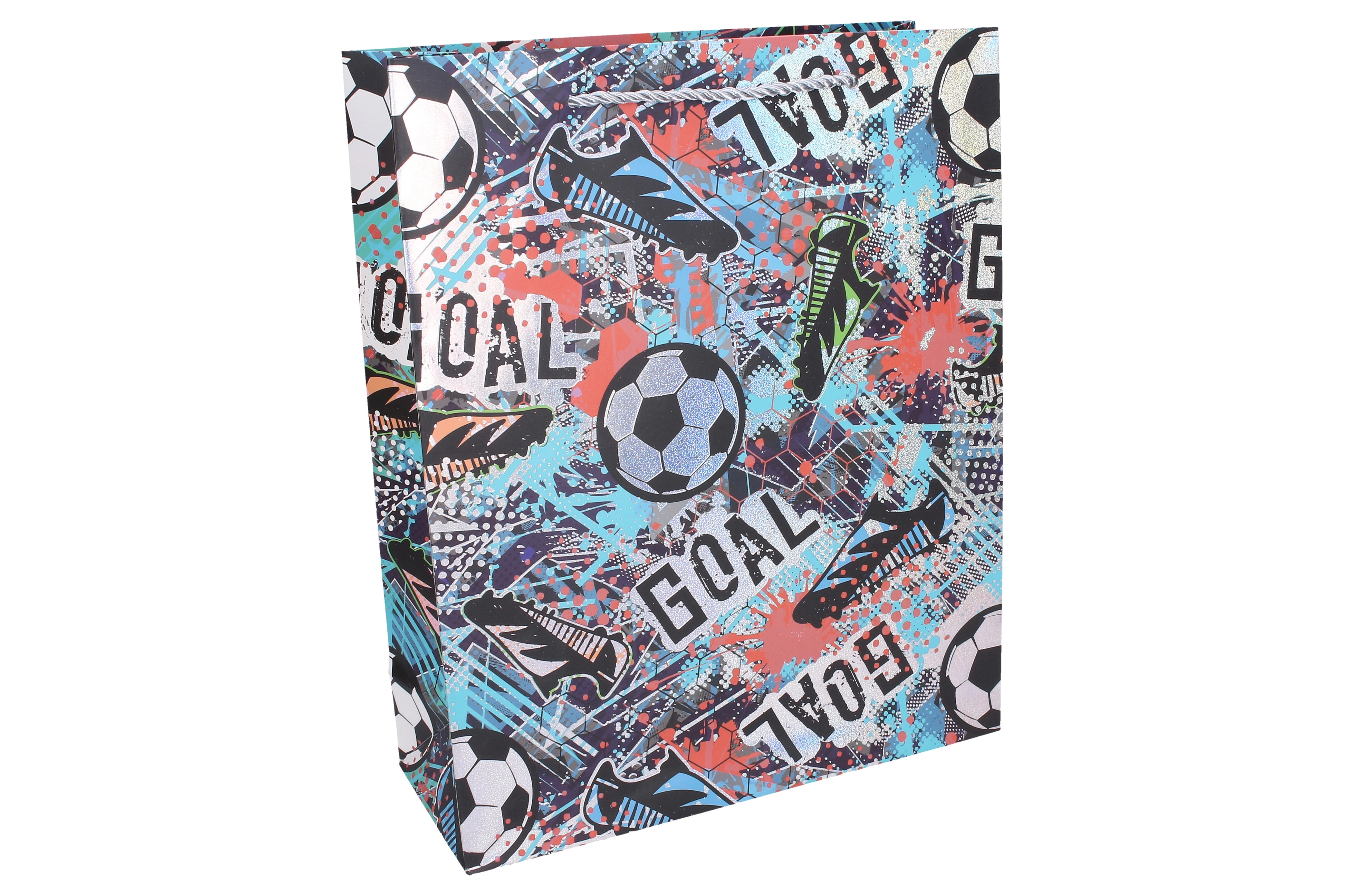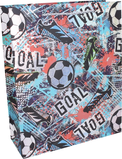 Stijlvolle cadeautas in maat L met afmetingen 31 × 42 × 12 cm en een aantrekkelijk voetbaldesign, perfect voor elke kleine fan. Dankzij het stevige papier, versterkte koordhandvatten en duurzame afwerking draagt hij veilig speelgoed en grotere cadeaus. Verkrijgbaar in 4 kleuropties met opvallende motieven van ballen, voetbalschoenen en teksten zoals “GOAL” of “TEAM” – ideaal voor verjaardagen, sportfeestjes en kinderparties.