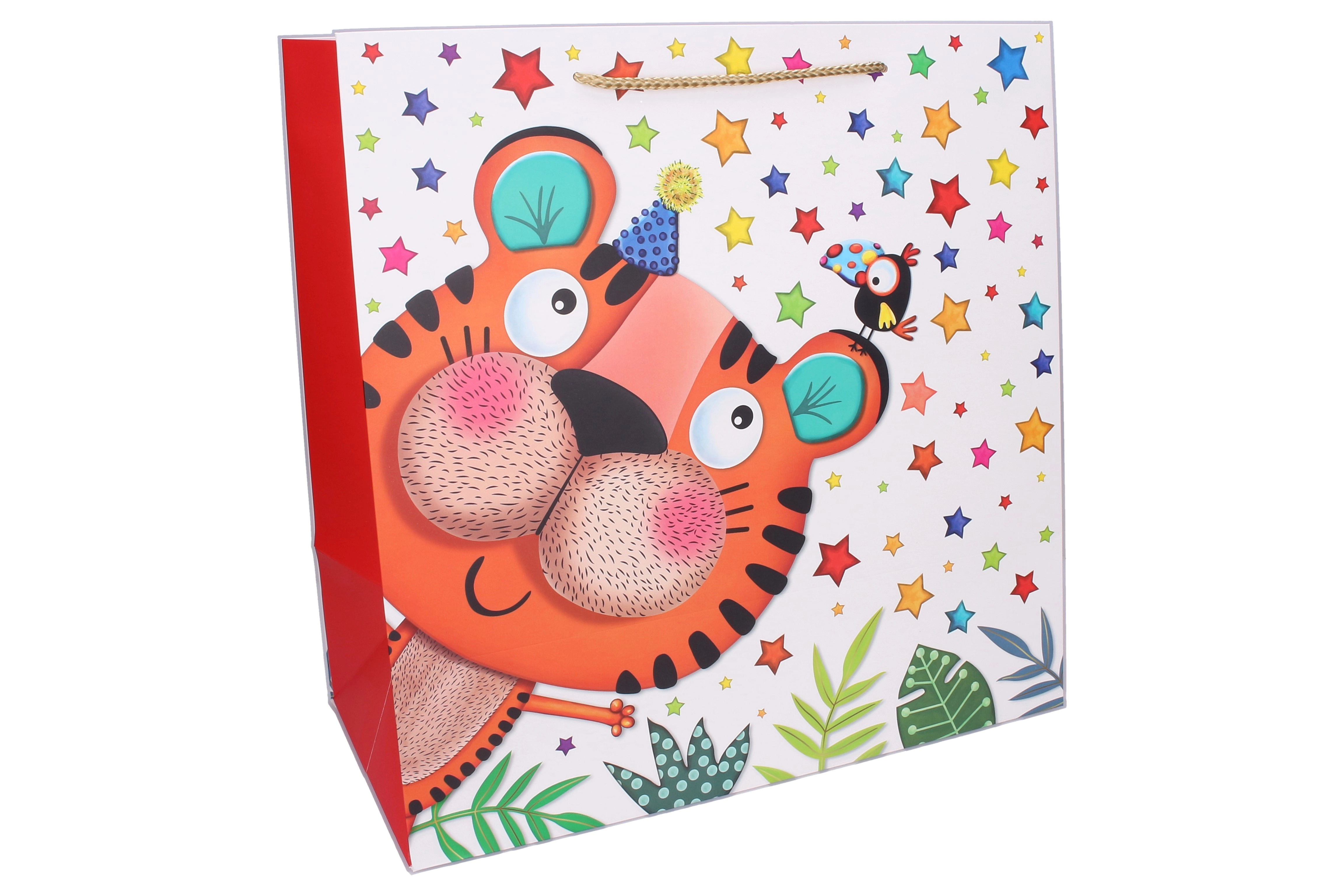 Kleurige illustraties van een tijger, olifant en giraffe met sterren, ballonnen en blaadjes geven je cadeau een magische uitstraling en maken kleine feestvierders enthousiast.