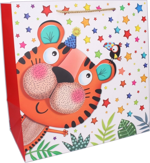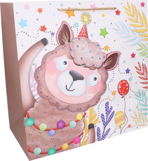 Vrolijke kindercadeautas in maat L met afmetingen 38 × 38 × 20 cm, ideaal voor verjaardagen en feestjes. Biedt een stevige papieren uitvoering, koorden handgrepen voor comfortabel dragen en schattige dierenmotieven (tijger, olifant, giraf, lama). Perfect als herbruikbare cadeautas met voldoende capaciteit dankzij de zijdelingse vouwplooien.