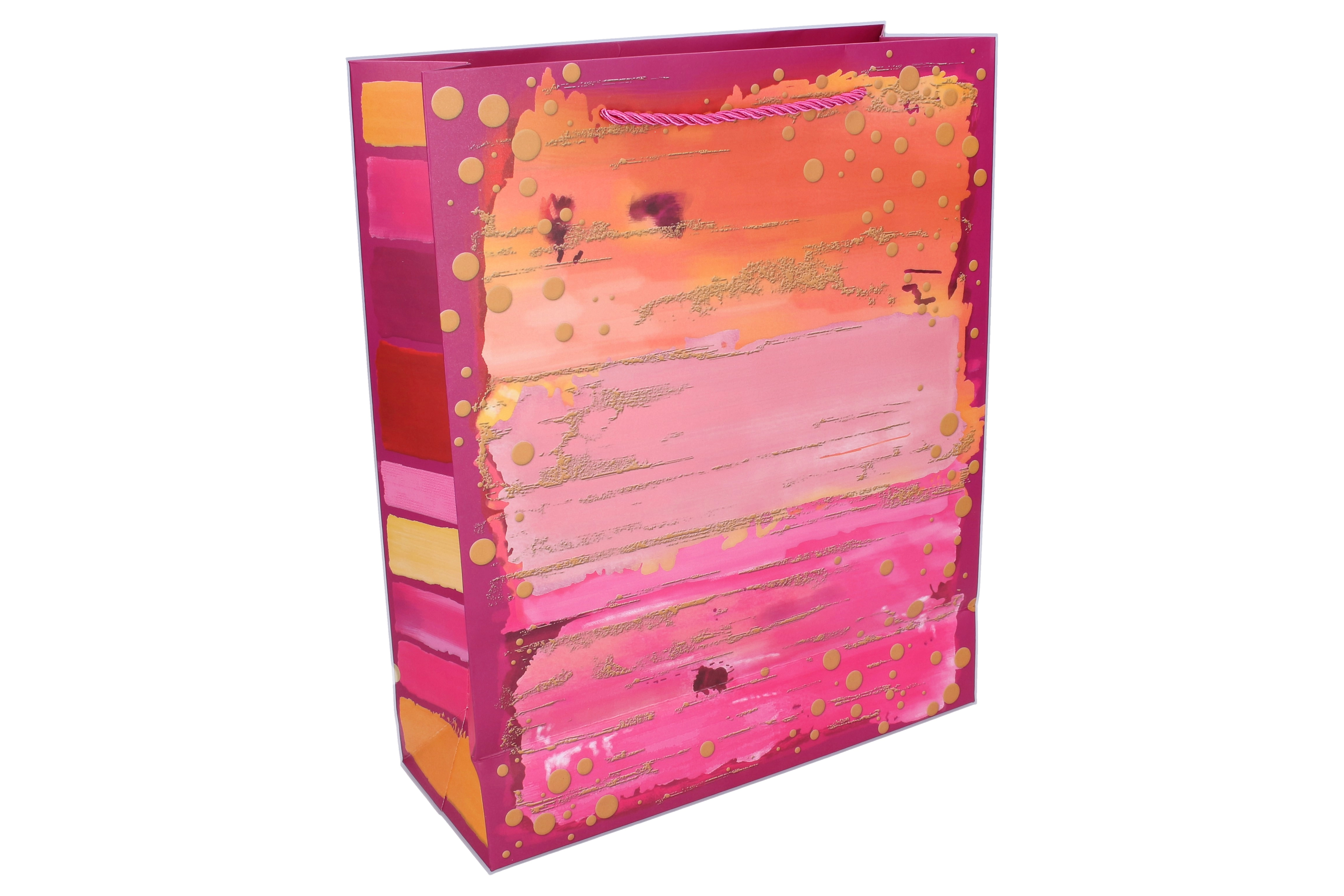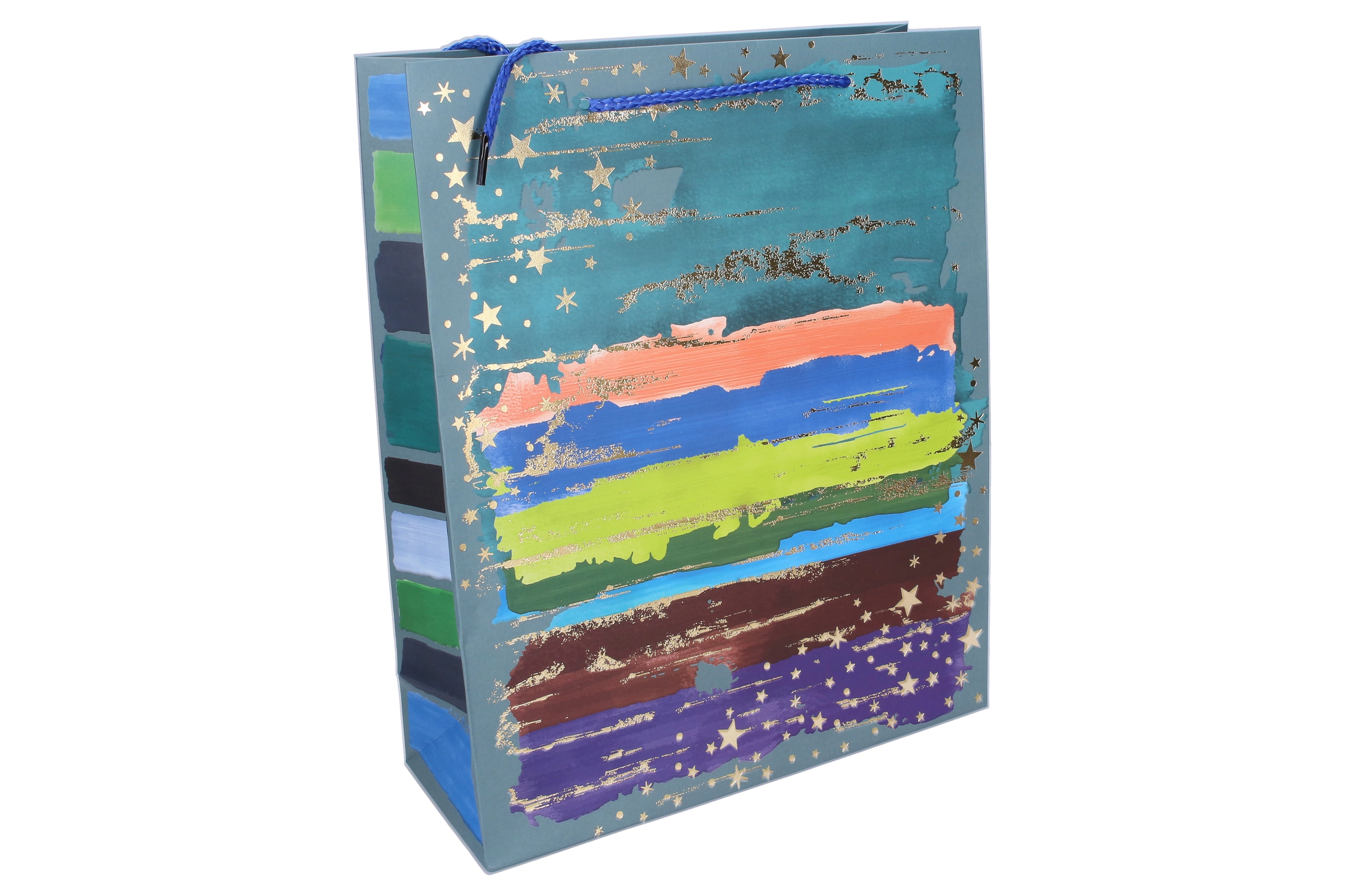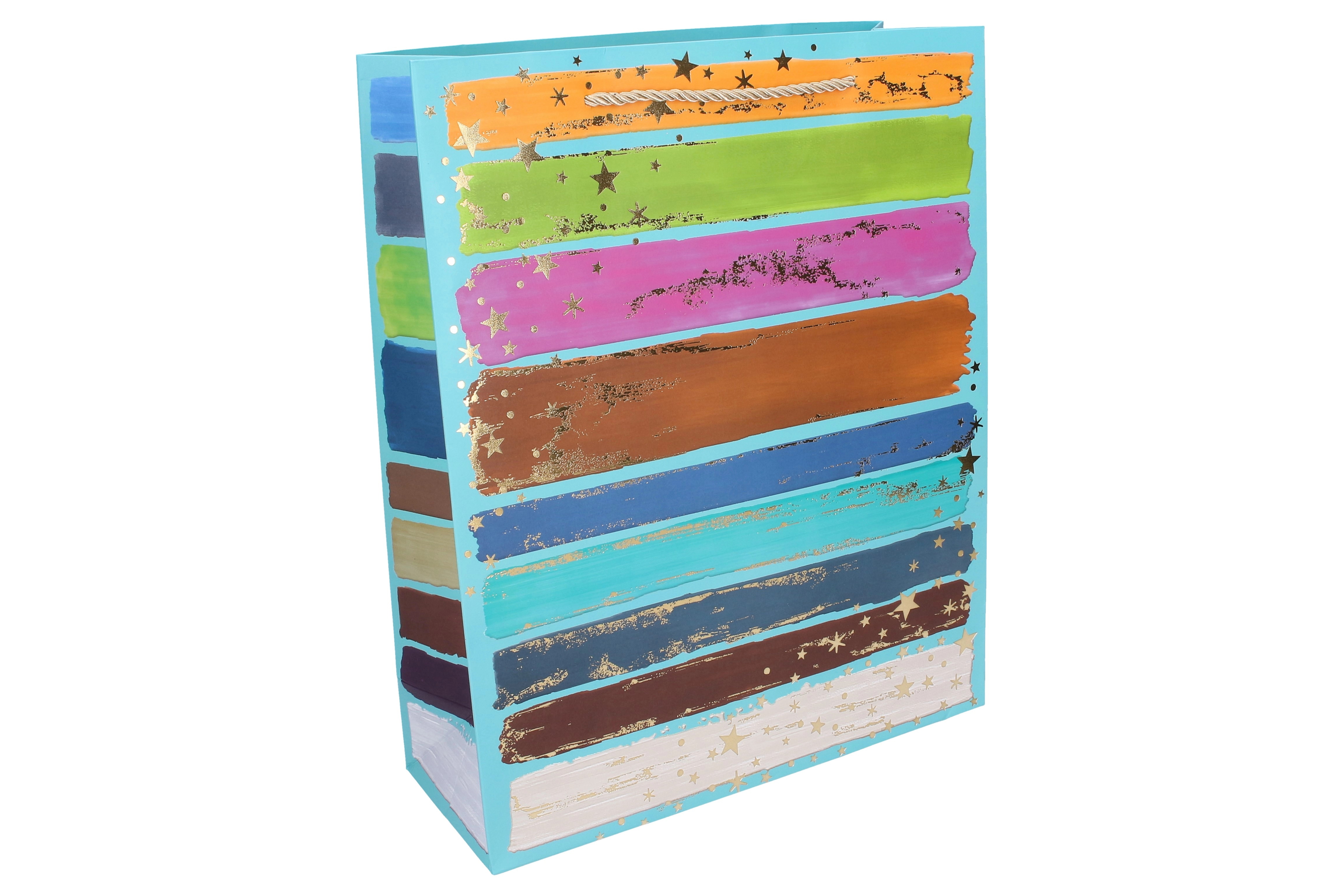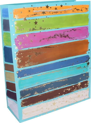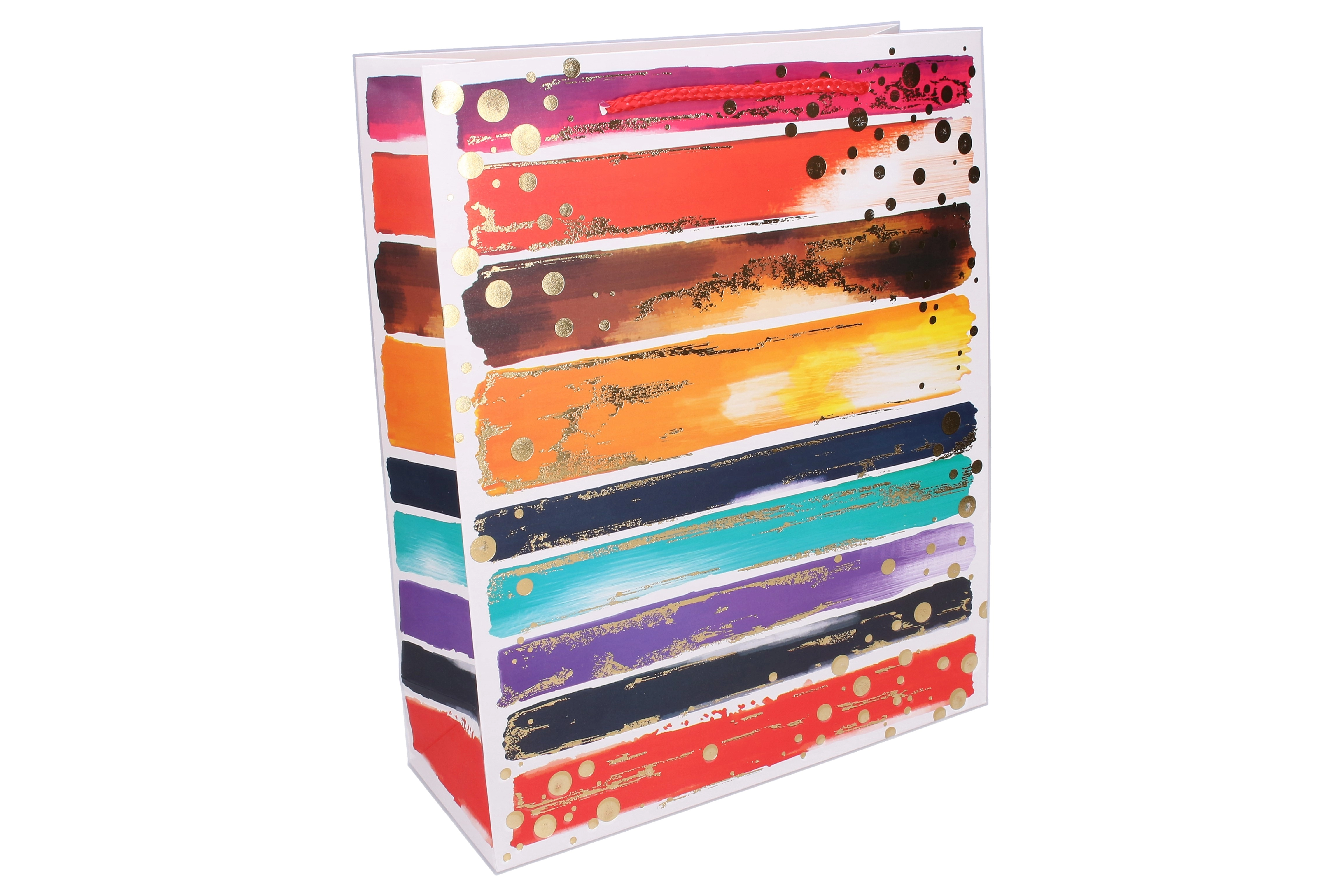 Deze universele cadeautas is ideaal voor verjaardagen, feestdagen en bedrijfsgeschenken. Dankzij het stevige papier, de kwalitatieve handvatten en de verstevigingen draagt hij de inhoud veilig en ziet hij er tegelijk representatief uit. Het moderne design met kleurrijke penseelstreken en metallic gouden elementen geeft elk cadeau een premium uitstraling.