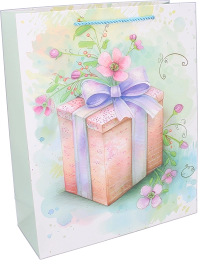 Op zoek naar een mooie en betrouwbare cadeauverpakking? Deze ruime cadeautas in maat L combineert stevigheid met stijl. Pastelillustraties van cadeaus, bloemen en strikken ogen zacht en feestelijk – perfect voor verjaardagen, feestdagen, bruiloften en bedankjes.