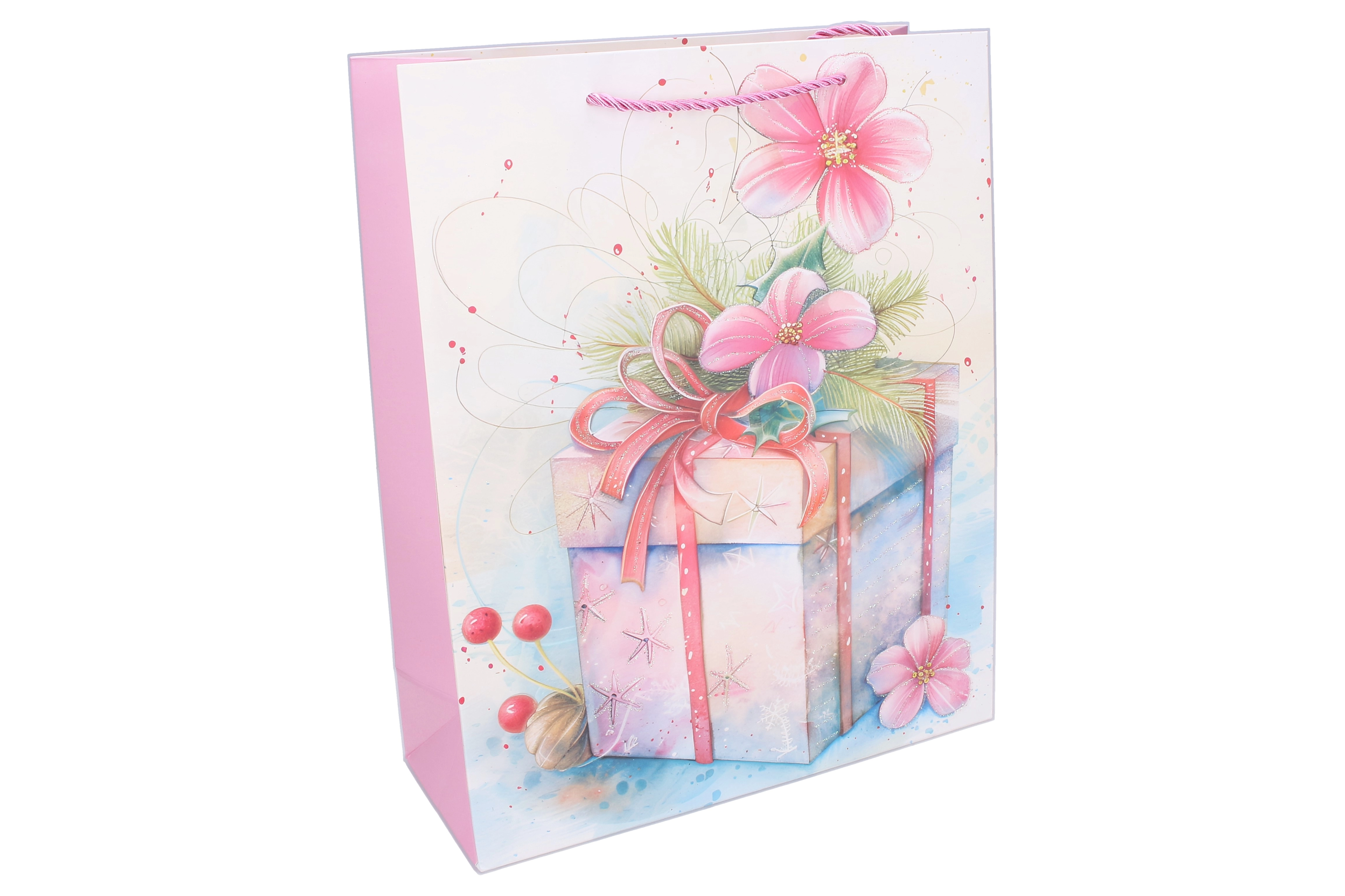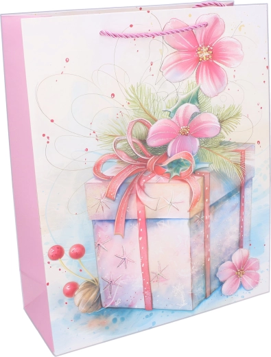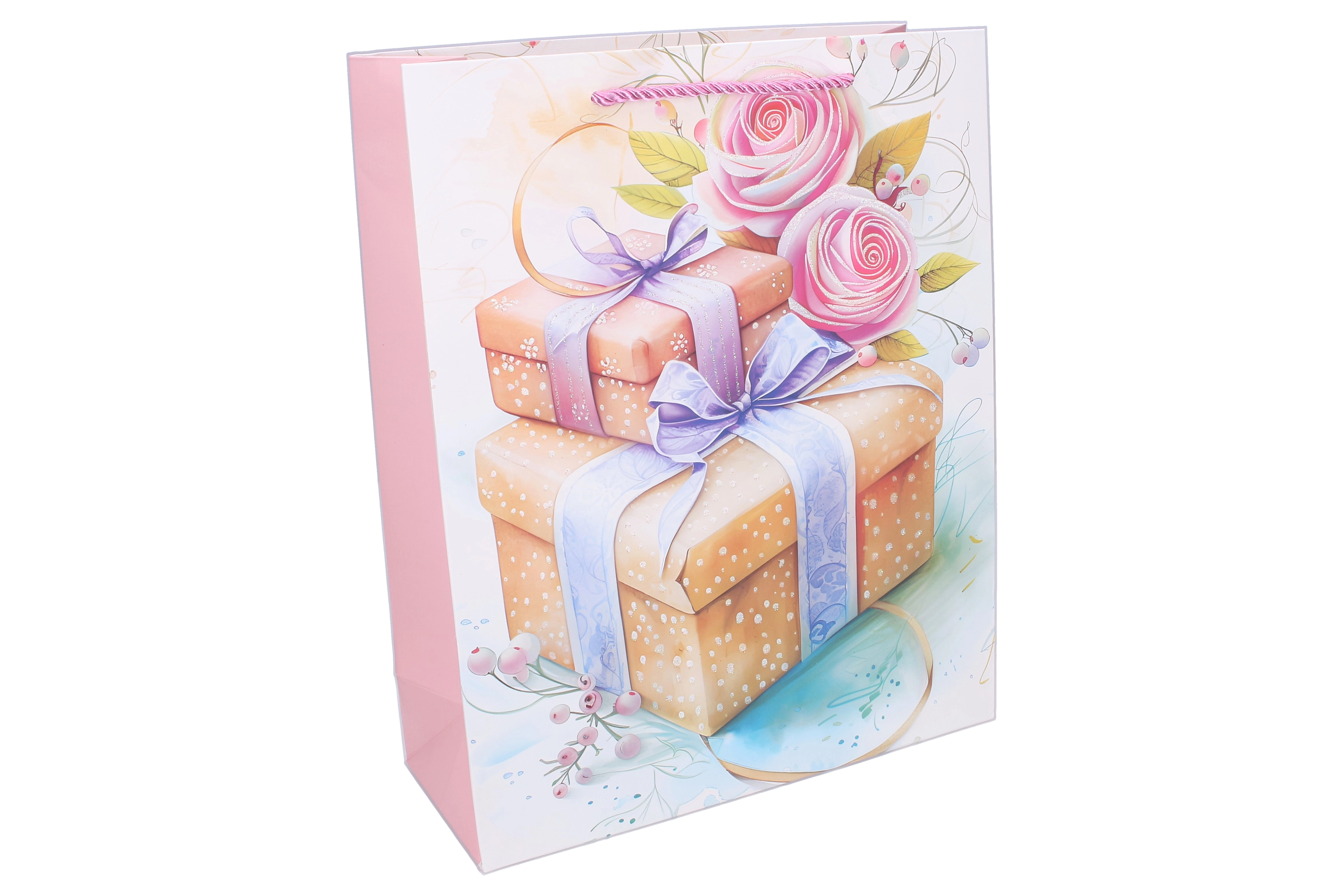 Stijlvolle cadeautas in maat L met afmetingen 30 × 40 × 12 cm, ideaal voor elegant inpakken het hele jaar door. Voorzien van een stevig koordhandvat, hoogwaardig papieren materiaal en zachte pastelmoten met bloemen en cadeaus, waardoor het een representatieve verpakking is voor elke gelegenheid.