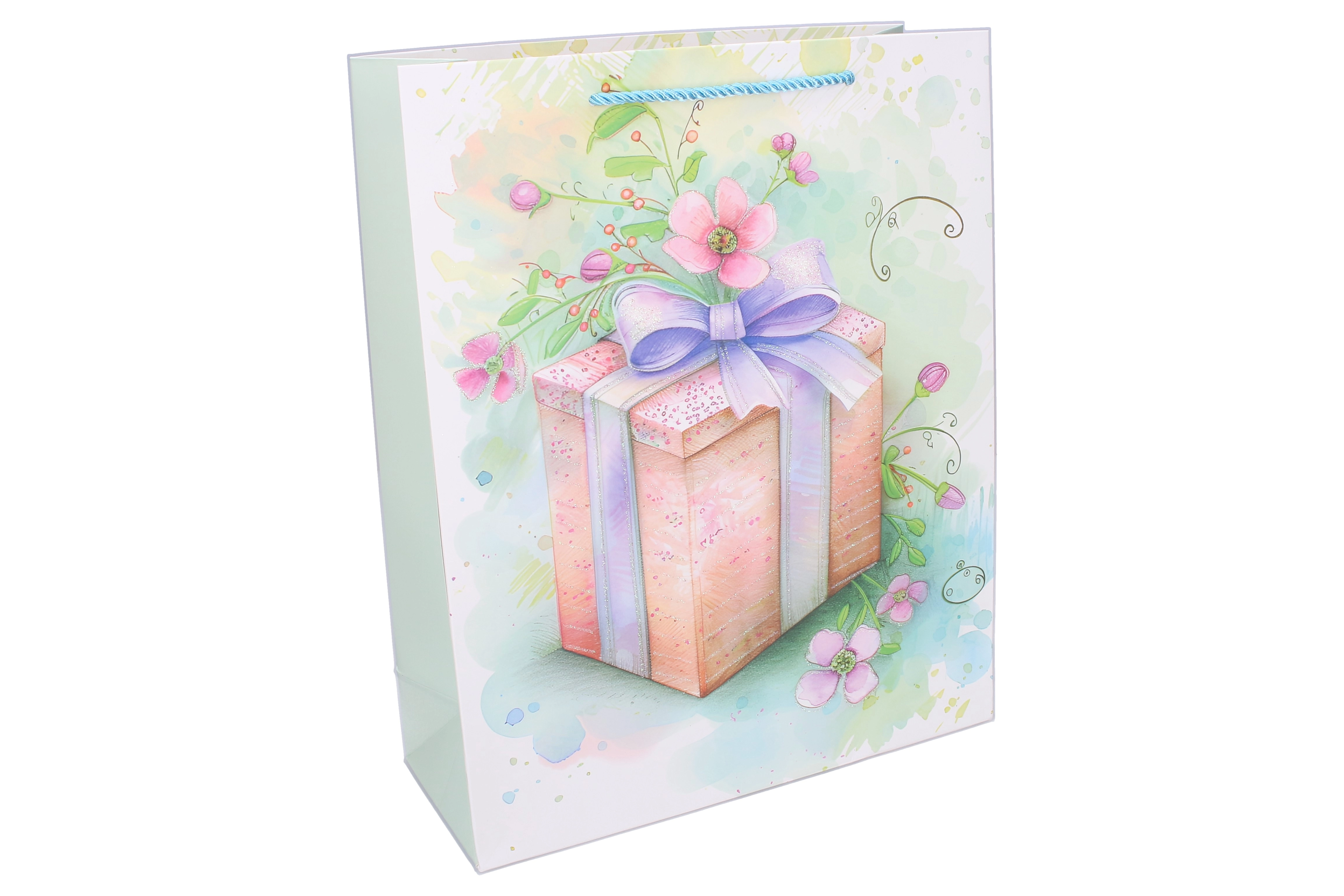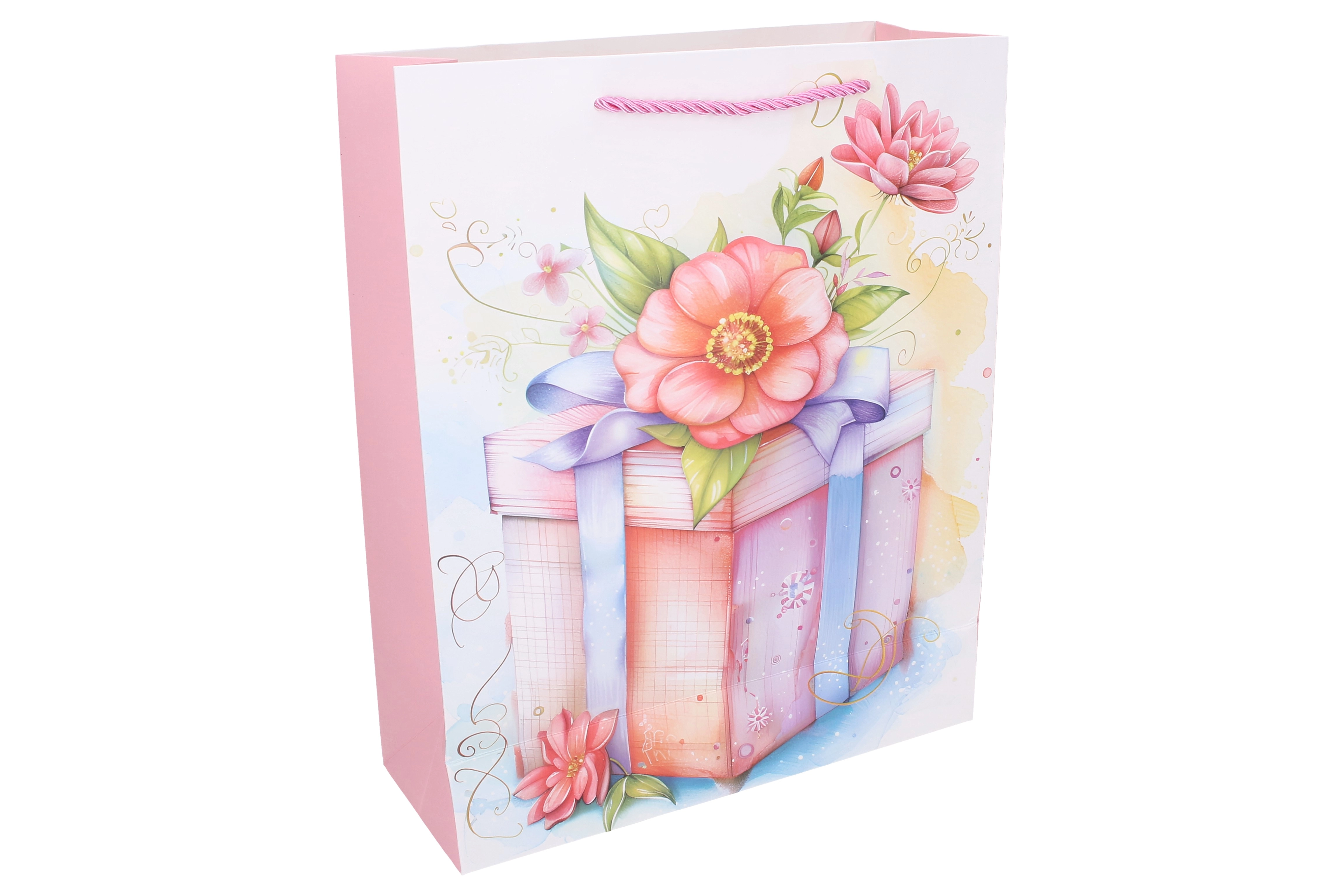 Dankzij de praktische afmetingen 26 × 32 × 10 cm draagt de tas moeiteloos middelgrote cadeaus. Stevige gedraaide handvatten maken het dragen makkelijker en hoogwaardig papier met verstevigde bodem helpt de vorm te behouden. De glanzende bedrukking en pasteltinten versterken de feestelijke indruk zonder extra inpakpapier.