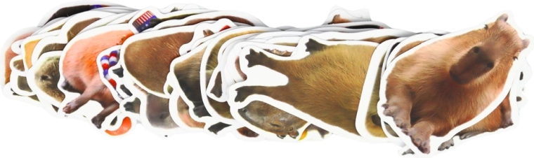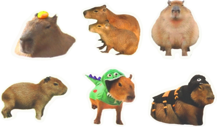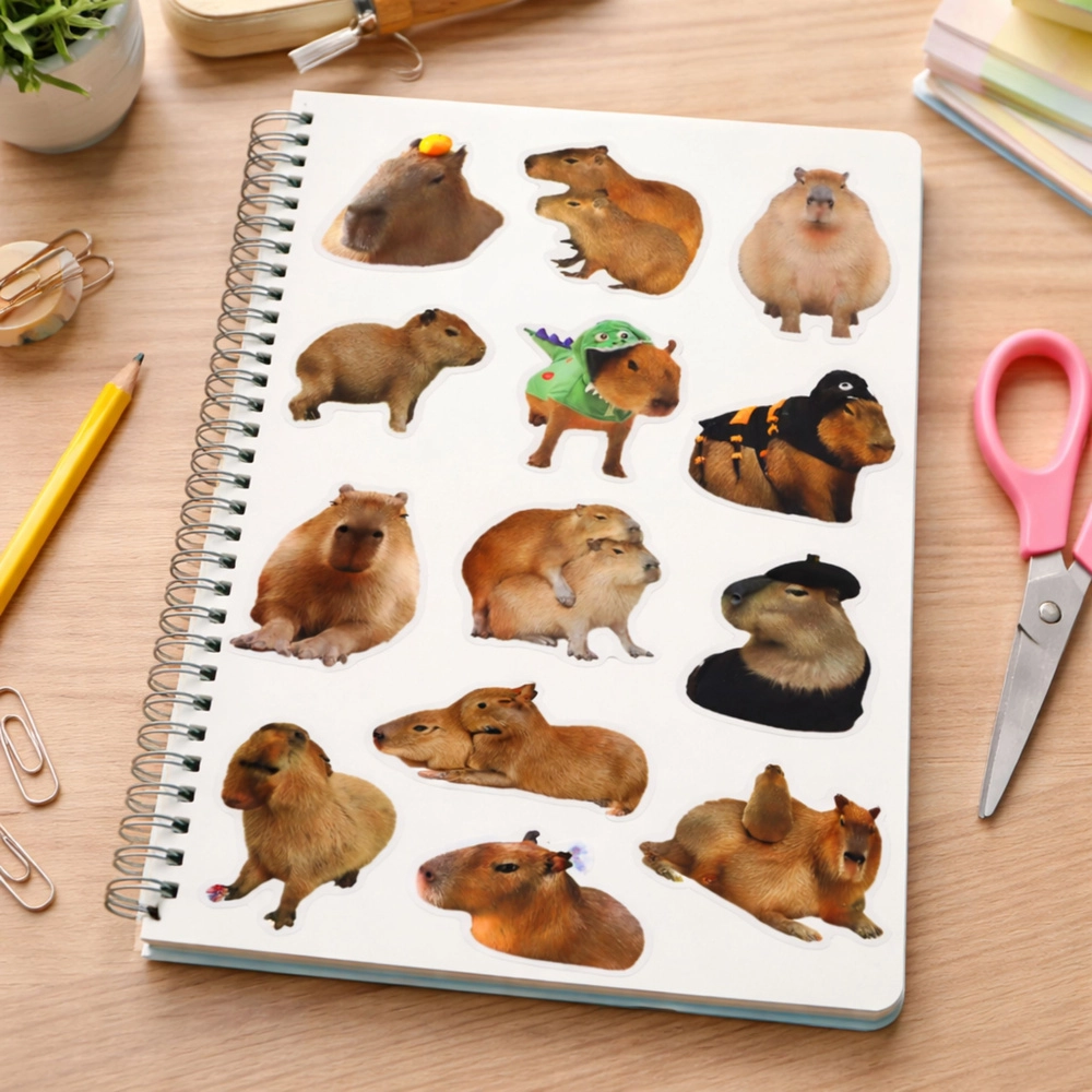 Elke sticker is gebaseerd op echte capibara’s – natuurlijke tinten, verschillende poses en gedetailleerde afwerking voor een authentieke uitstraling in elk project.