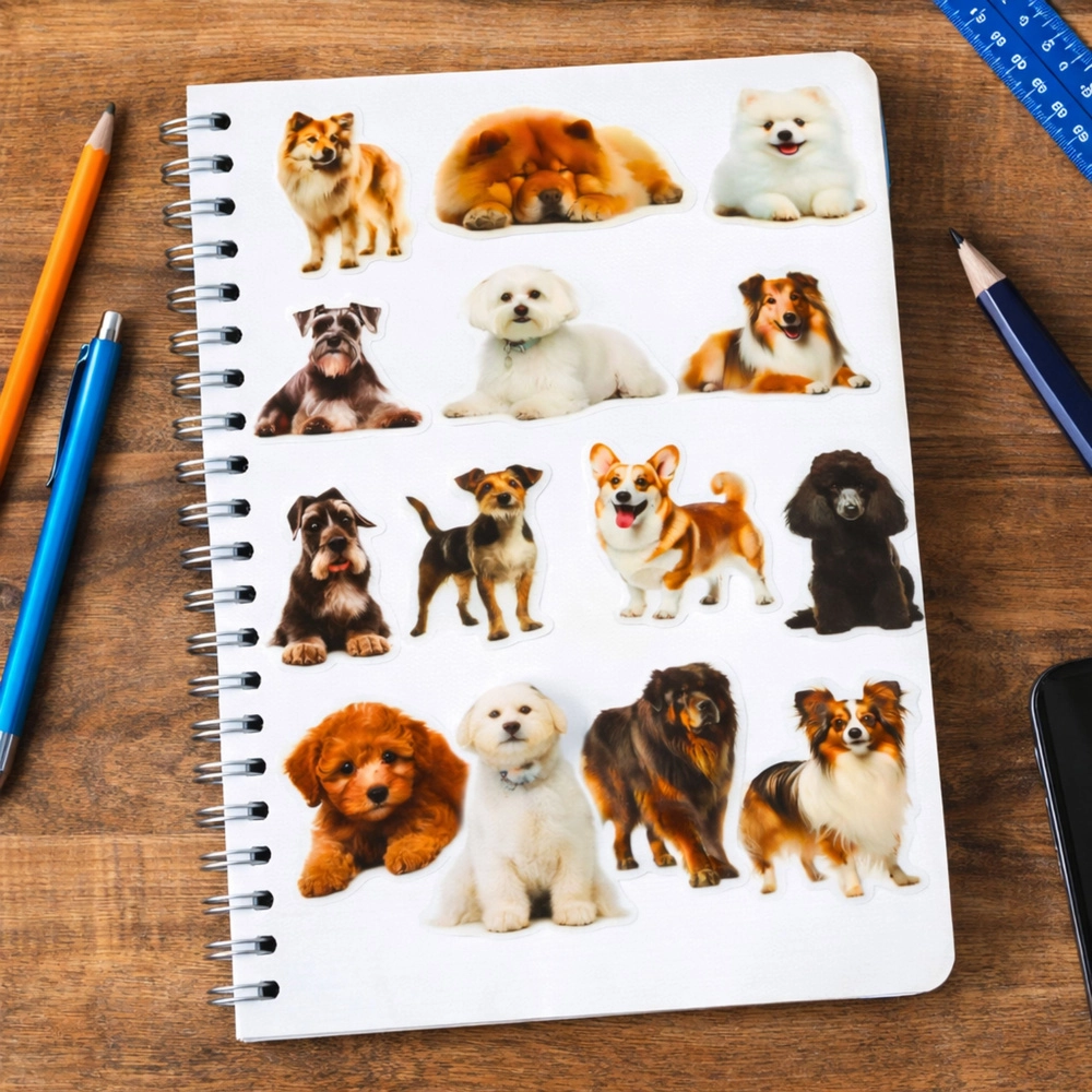 Ontdek een creatieve set van 50 stickers met hondenthema met een formaat van ca. 6 cm. De stickers hebben een transparante achtergrond en een glanzend oppervlak, waardoor ze naadloos op elke ondergrond passen. Ideaal voor het versieren van schriften, planners, albums en cadeaus en voor knutselen met kinderen.