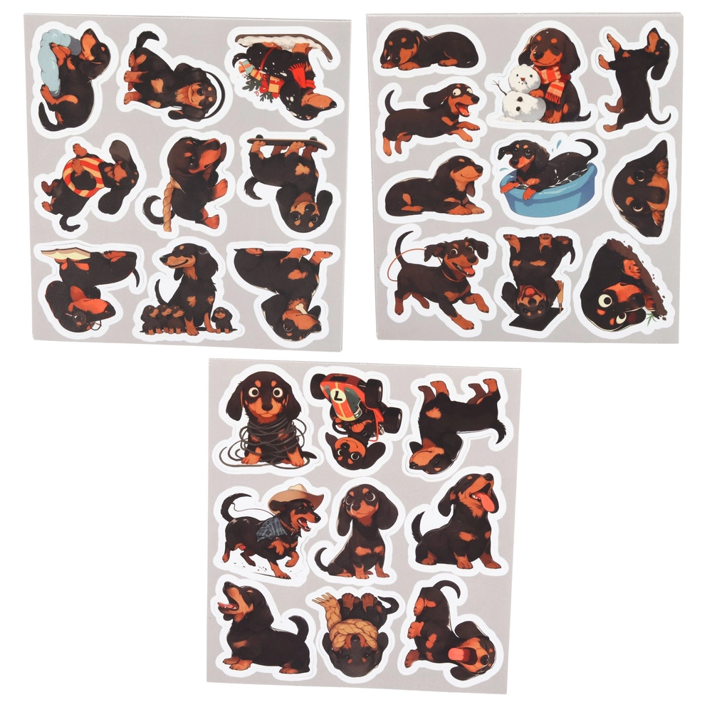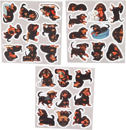 Schattige set stickers met teckelmotief met 54 verschillende designs voor het versieren van schriften, dagboeken, planners of cadeaus. Elke sticker toont een teckel in een andere pose, zodat je eenvoudig originele composities kunt maken. De stickers zijn makkelijk los te halen en kleven goed, hebben een praktisch formaat van ca. 5–6 cm en hechten uitstekend op gladde oppervlakken.