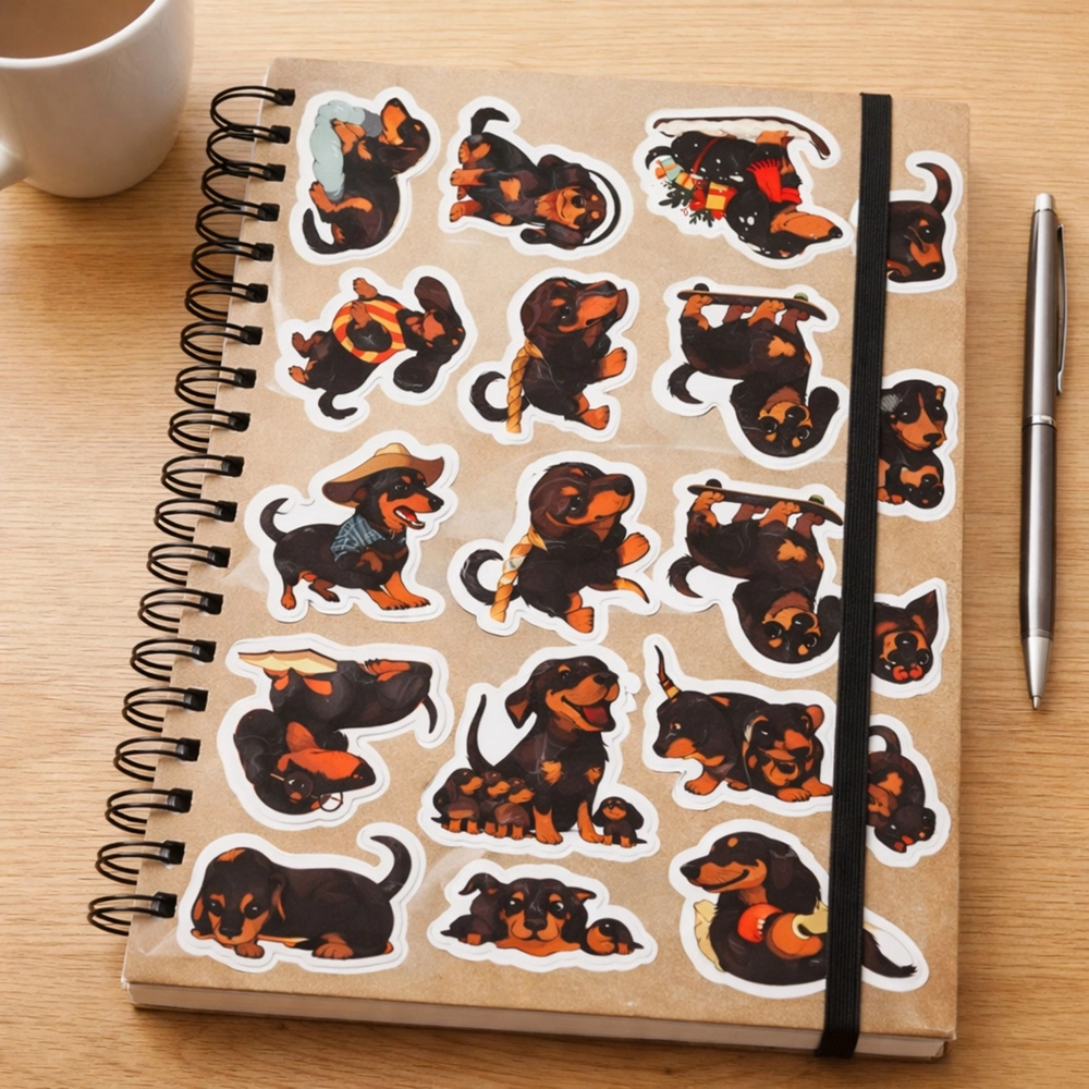 Geef je notities en projecten een speelse sfeer. Deze veelzijdige set biedt een brede selectie teckelmotieven – van relaxen op kussens tot vrolijke activiteiten – en is daardoor perfect voor journaling, scrapbooking en creatief knutselen.