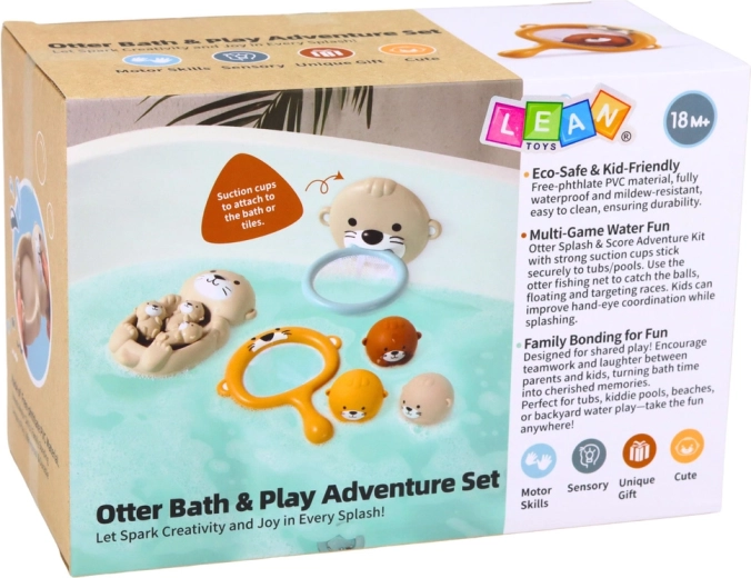 Schattige badset met ottermotief die elke badtijd leuk maakt. Bevat een grote otter met jongen, een mandje met net en zuignap en twee zachte ballen. De speeltjes drijven op het water, je kunt ze vangen en in het mandje gooien en dankzij het zachte, veilige materiaal zonder ftalaten zijn ze ideaal voor zintuiglijke prikkeling en de ontwikkeling van de fijne motoriek bij kinderen vanaf 18 maanden.