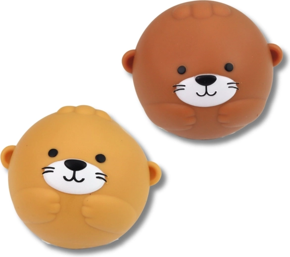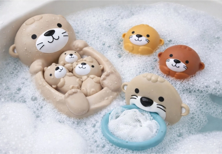 De grote otter met jongen en twee ronde ballen drijven op het water, nodigen uit om te vangen en te knijpen en stimuleren coördinatie en fijne motoriek.