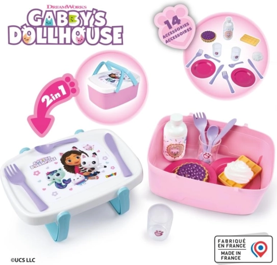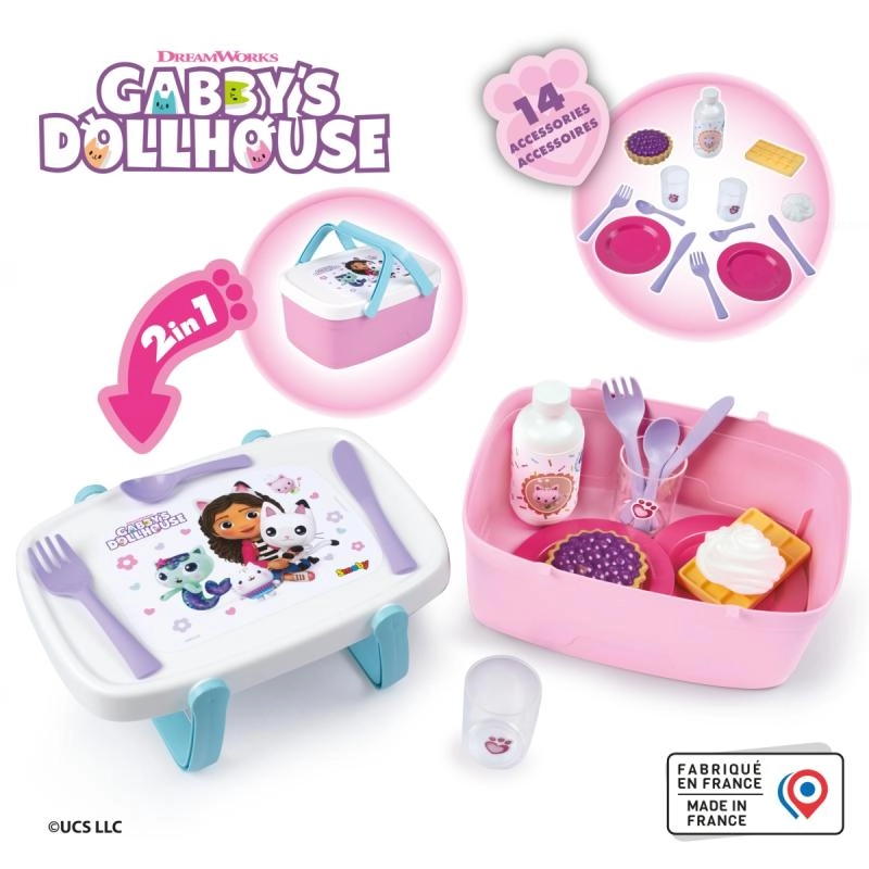 Deze schattige 2-in-1 picknickmand zorgt voor uren creatieve speelpret. Dankzij de slimme oplossing verandert het deksel na het neerklappen van de handgrepen in een praktisch tafeltje waarop kleine gastheer of -vrouw drankjes en lekkers kunnen serveren. Het thematische design van GABBY’S DOLLHOUSE maakt alle fans van de populaire serie blij.